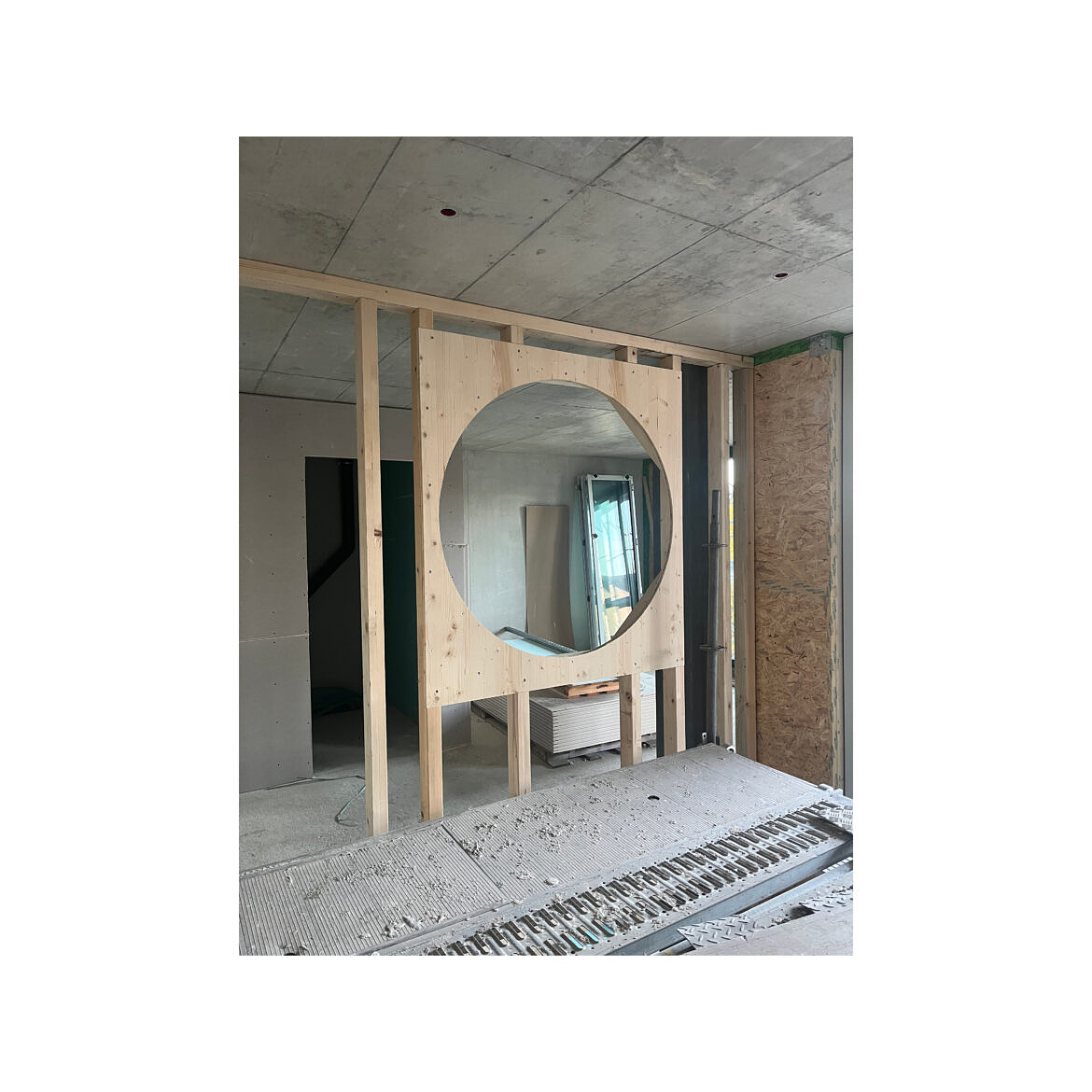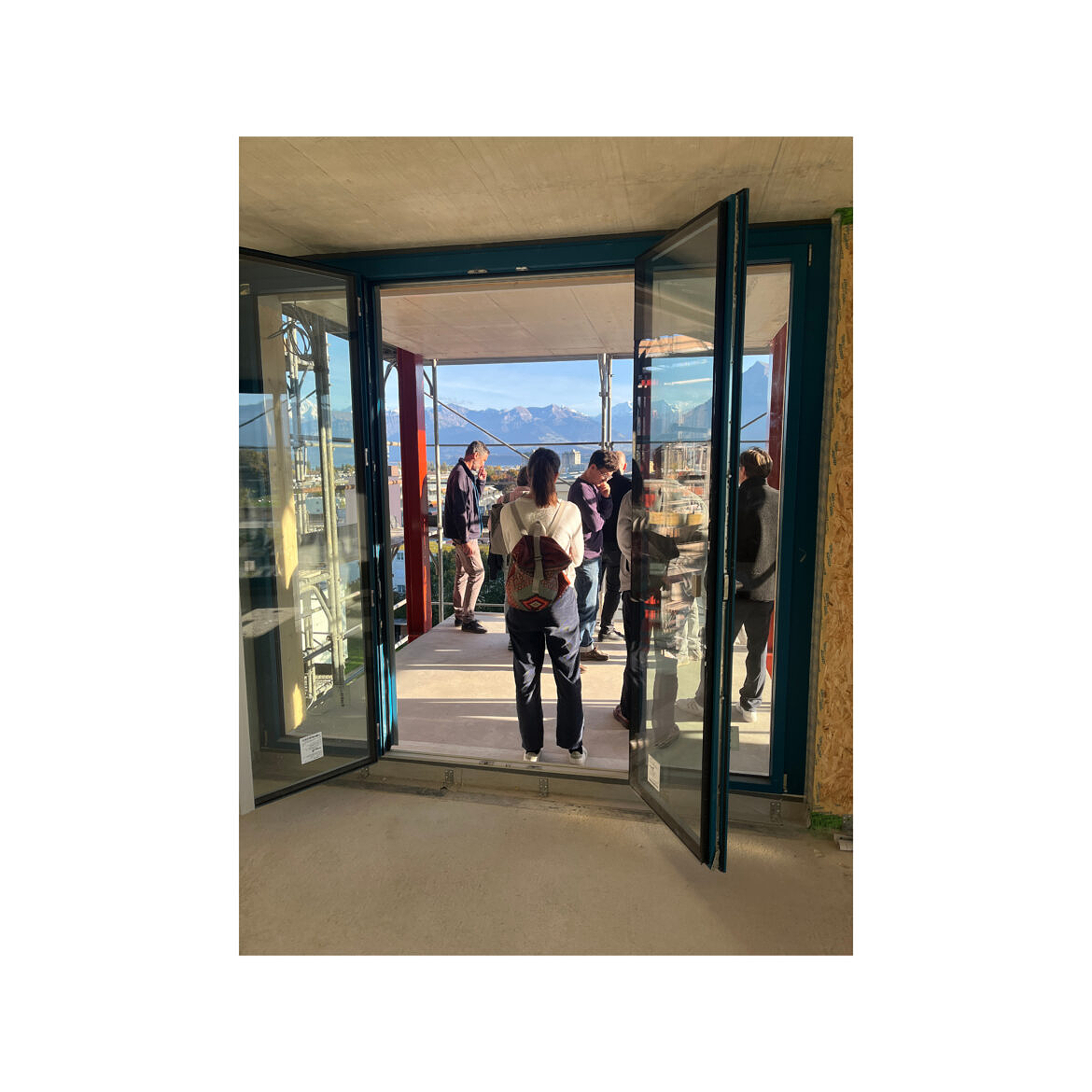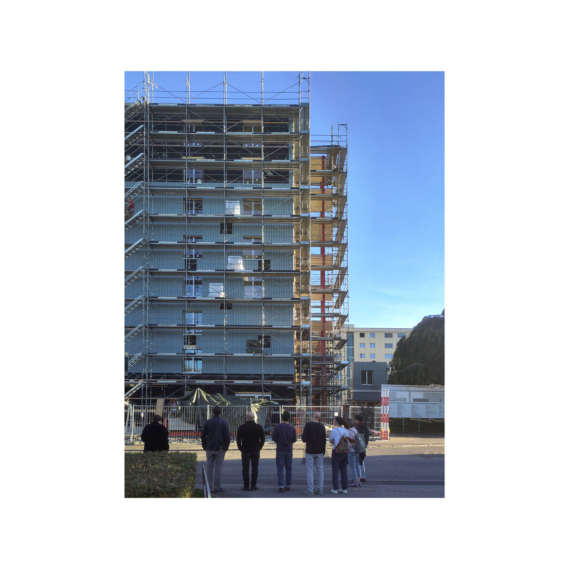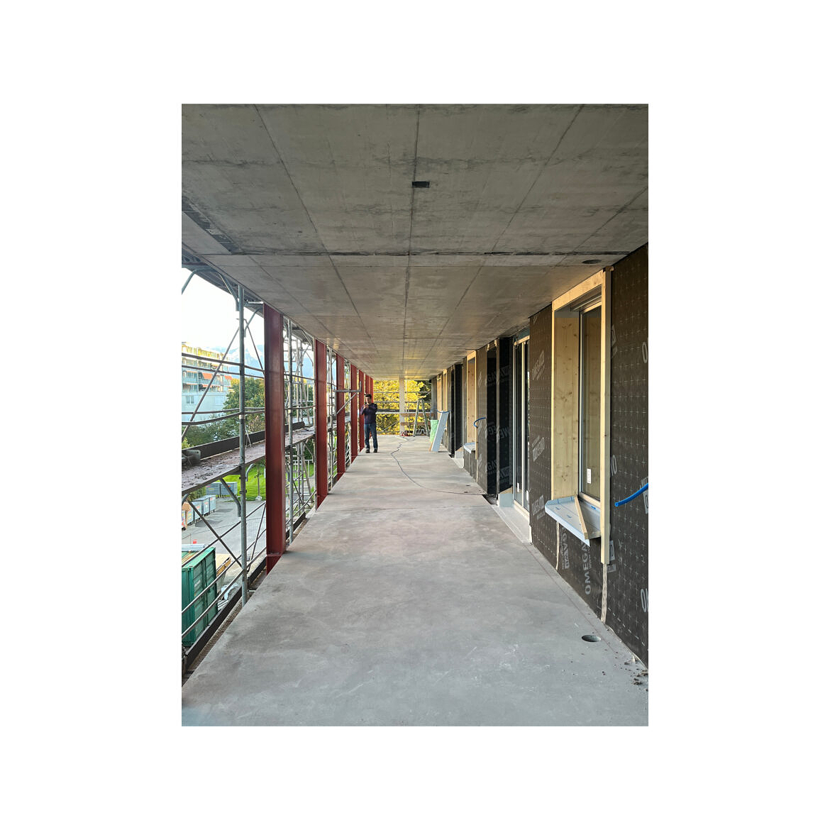Die Gewerbefläche im Erdgeschoss ist erlebbar | Der Laubengang ist schon fast fertig | Die Aussicht stimmt | Die runden Fenster im Treppenhaus sind in Vorbereitung | Die Welleternit-Fassade mit Farbkonzept von Dominik Stauch wirkt