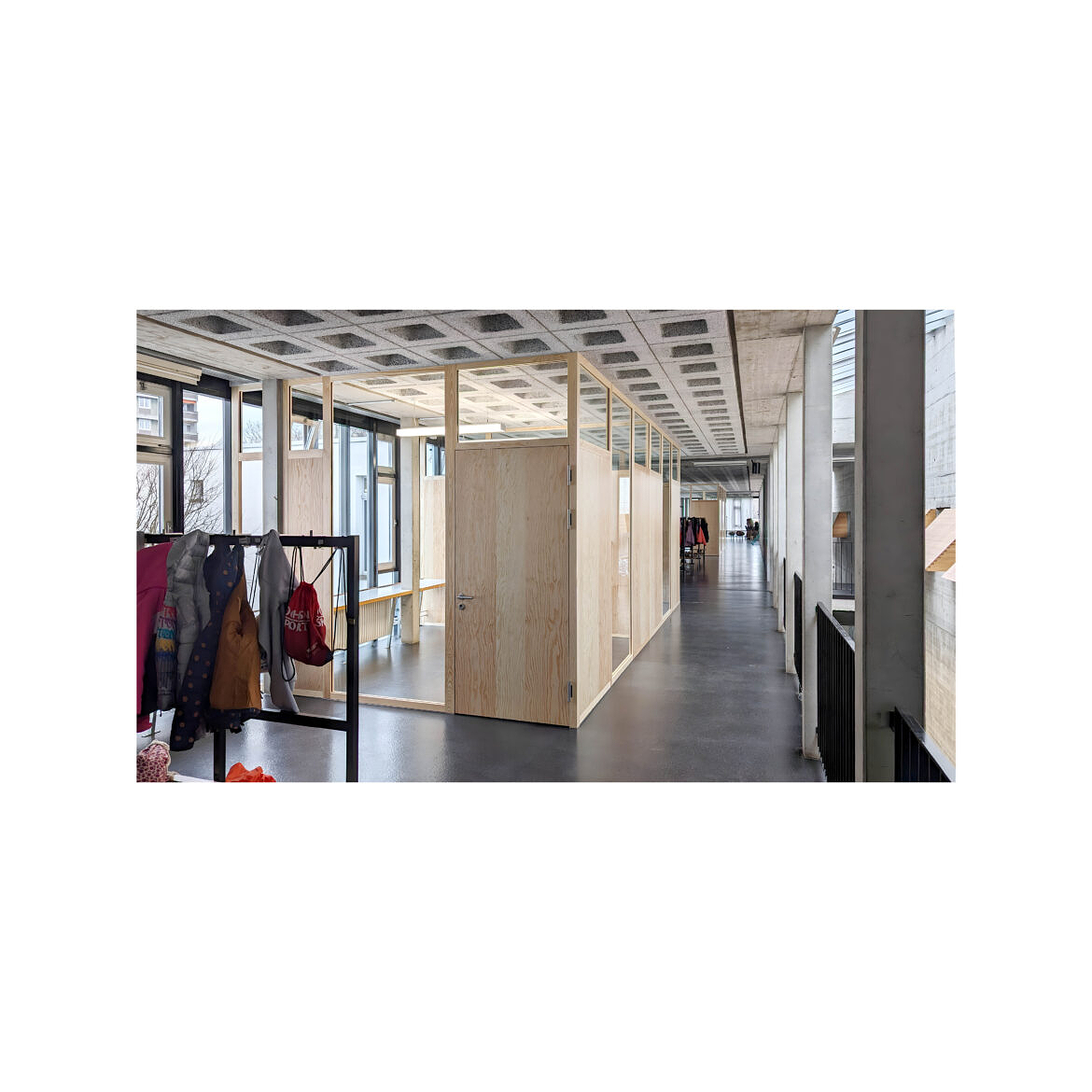 In der Kantonalen Französischsprachigen Schule (ECLF) an der Jupiterstrasse in Bern, Ende der 1980er-Jahre von Somazzi Häfliger Grunder Architekten realisiert, fehlte Platz für den Sonderunterricht mit Kleingruppen. Mit dem Amt für Grundstücke und Gebäude (AGG) als Auftraggeberin und in Absprache mit der Städtischen Denkmalpflege konnten wir in den grosszügigen Korridorzonen des schützenswerten Gebäudes Einbauten mit möglichst geringfügigem Eingriff in die bestehende Substanz realisieren.
