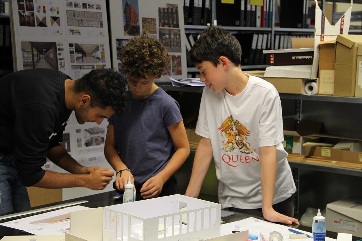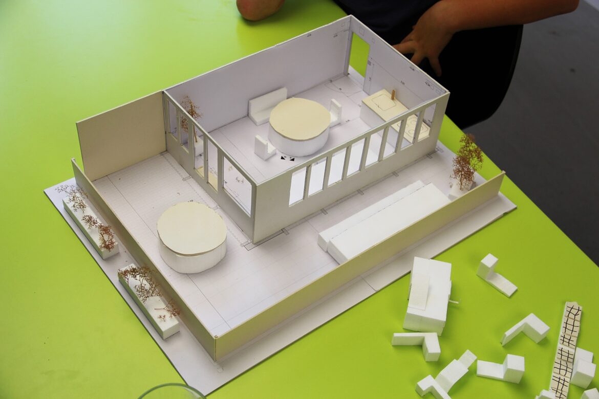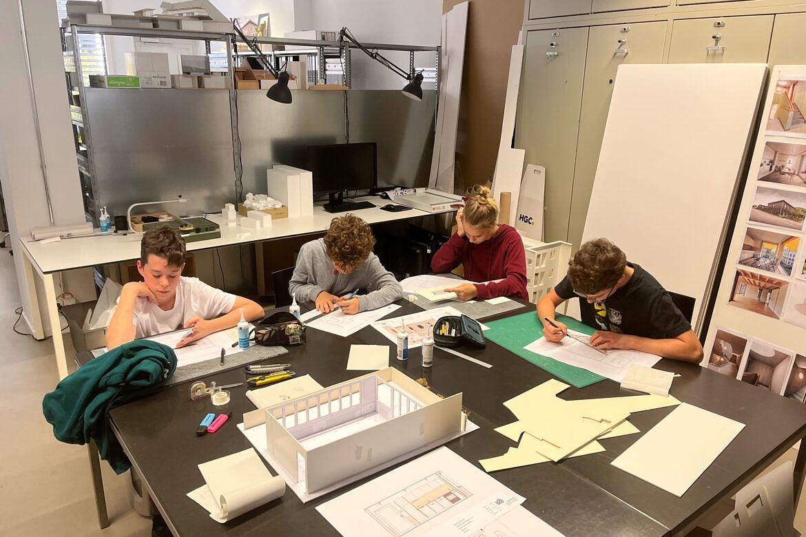 Vor dem Mittag erhielten die Vier einen Einblick ins CAD und in die 3D-Planung von Gebäuden. Nach Pizza im Büro konnten sie dann selber kreativ werden und ihre Vorstellungen und Überlegungen zur Gestaltung eines Pausenraums im Modell bauen und darstellen.