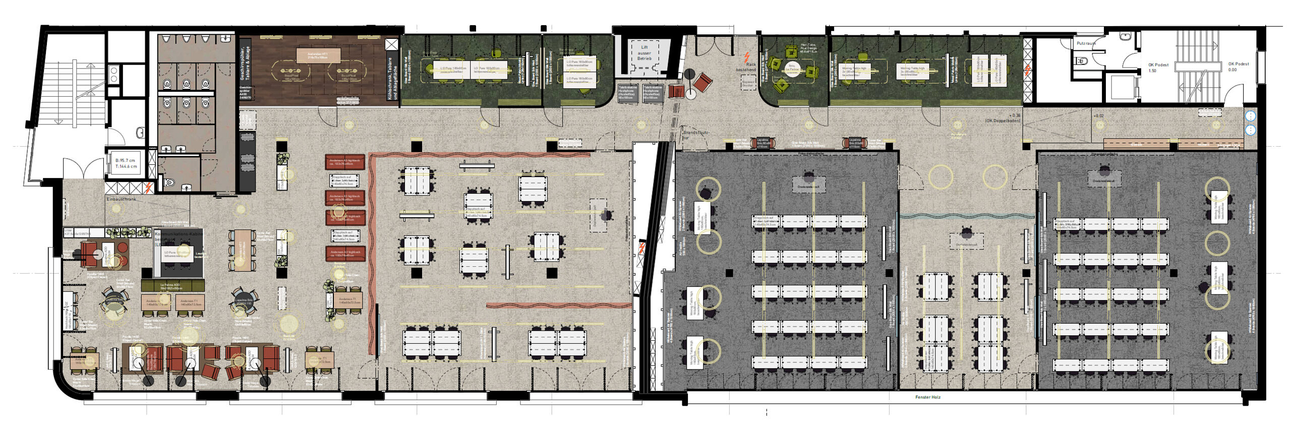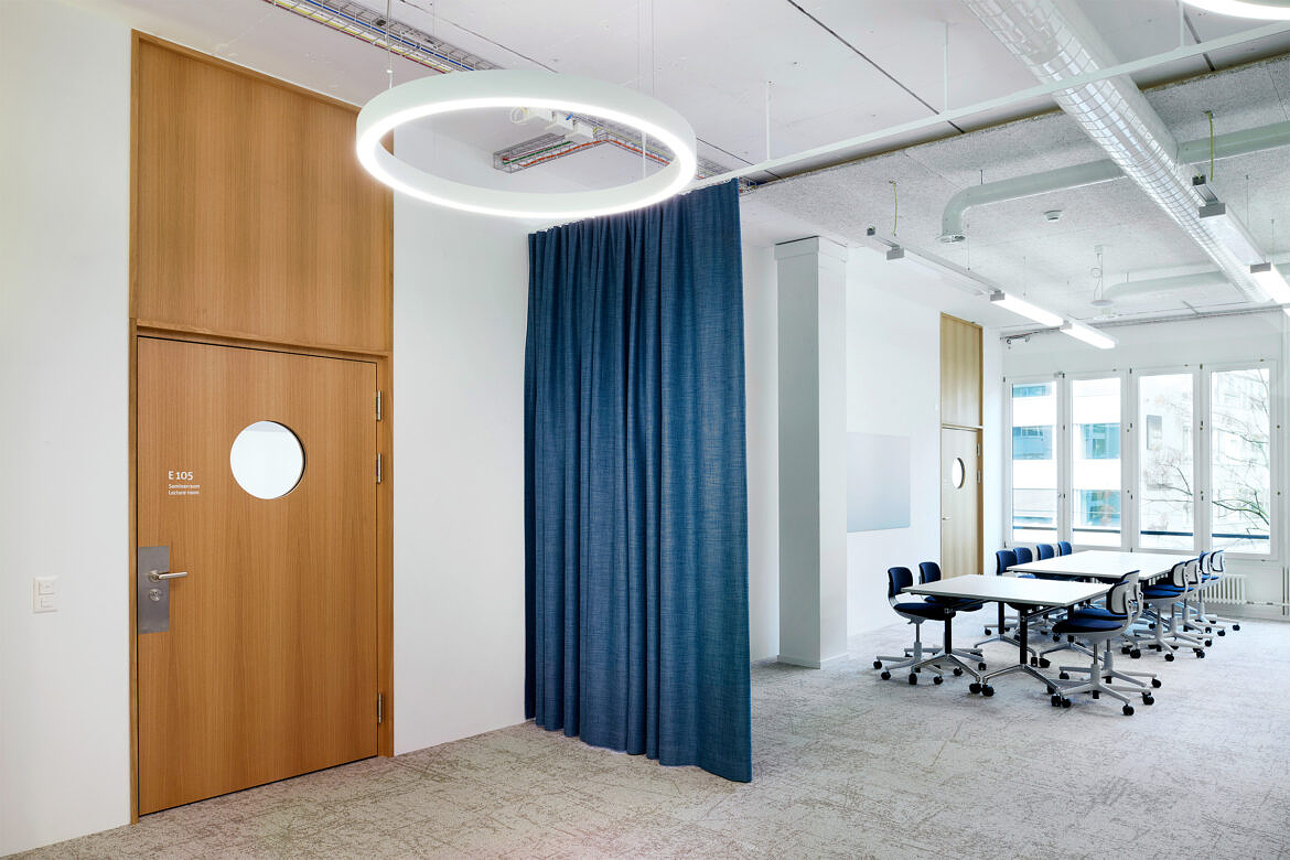 Die Dynamik des didaktischen Konzeptes des Departements Wirtschaft widerspiegelt sich in der neuen Raumstruktur. Es wurden verschieden grosse und flexible Räumlichkeiten geplant, um auf die unterschiedlichen Unterrichtsformen zu reagieren. Im hinteren Bereich sind zwei grosse, durch neue Leichtbauwände begrenzte Seminarräume angeordnet. Den vorderen Bereich bilden wir mit dem Zusammenschluss des Aufenthaltsbereiches und einem weiteren Seminarraum zu einer offenen und flexiblen Situation aus. Mittels Schallschutz-Vorhängen können die Räume zusammengelegt oder abgetrennt werden. An der Ostfassade entlang des Korridors wird die bestehende kleingliedrige Raumstruktur belassen und zu Projekträumen ausgebildet. Der Wunsch nach einer hohen Flexibilität wird durch das Mobiliar eingelöst. Die Rollen an den Stühlen, Tischen und Whiteboards sowie die Klappfunktion an den Tischen ermöglichen ein einfaches Umstellen zu verschiedenen Unterrichtssituationen.