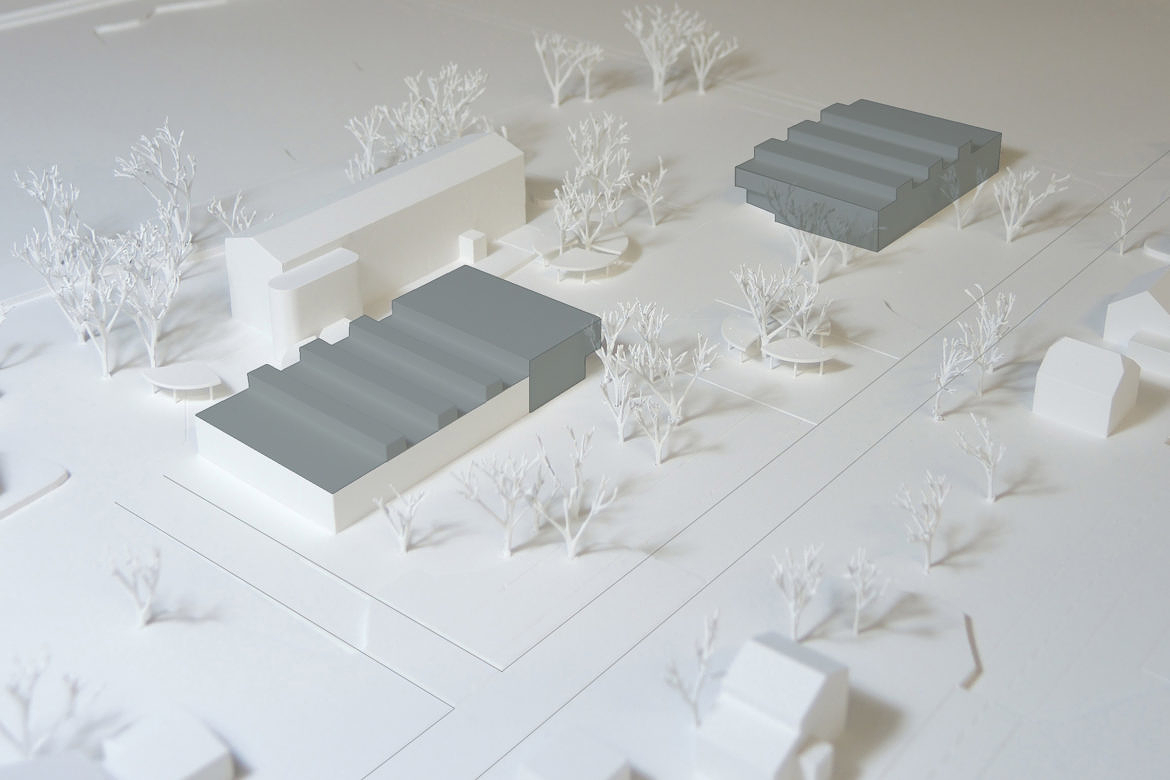 Alle Räumlichkeiten, die von der Schule genutzt werden, sind in der Mehrzweckhalle untergebracht. Dadurch profitieren die neuen Werkräume von der unmittelbaren Nähe des Schulgebäudes. Um das zusätzliche Raumprogramm in der Mehrzweckhalle unterzubringen wird der bestehende Hallenbau um eine Achse erweitert. Das neue Foyer, orientiert sich zum zentralen Zugangsplatz und erhält damit einen ihm entsprechenden öffentlichen Charakter mit klarer Adressbildung.