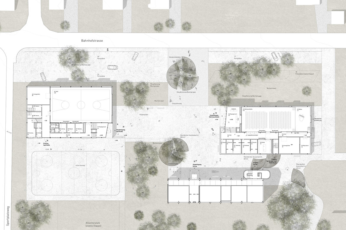 Über einen zentralen Zugang betritt man den neuen Pausenplatz. Er wird durch drei Volumen definiert und dient als Orientierungsort der Parzelle. Alle Eingänge der Häuser zeigen auf den Platz. Seitlich der Parzelle liegt die Anlieferung der Mehrzweckhalle, so können die verschiedenen Verkehrsströme ideal getrennt werden.