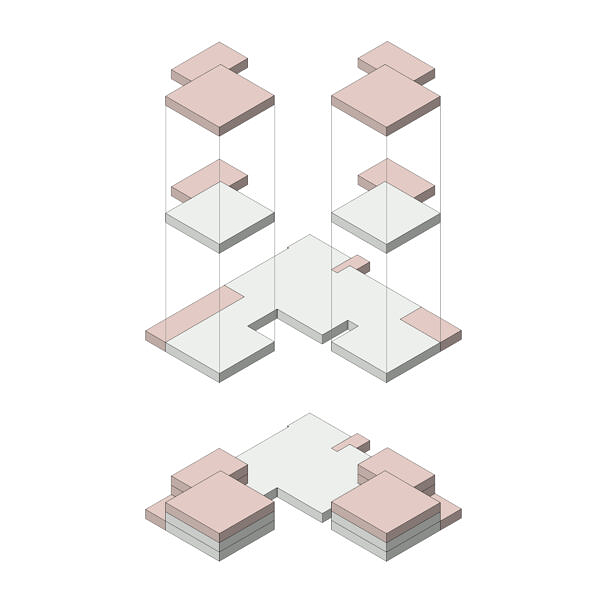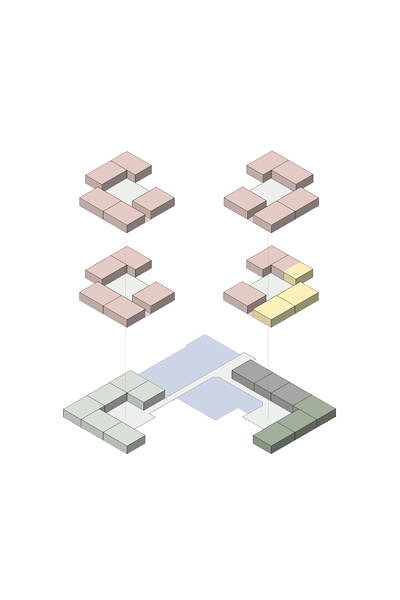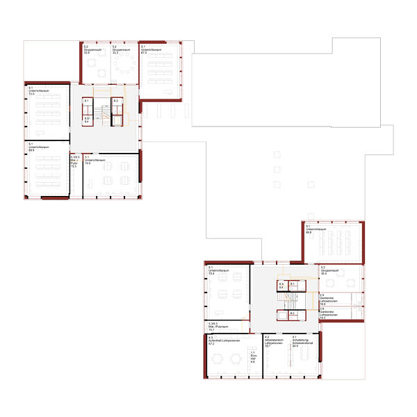 Die beiden bestehenden Trakte werden erweitert und aufgestockt und so das gesamte Programm kompakt untergebracht. Die prägende Gliederung der Bauten und die Grosszügigkeit des Freiraums bleiben erhalten. Aufbauend auf der bestehenden Erschliessungsfigur sind die Regelklassen in den Obergeschossen beider Trakte untergebracht. Pro Geschoss werden neu vier Klassenzimmer und die dazugehörige Infrastruktur organisiert. Das Geschoss eines Traktes bildet die kleinste, überschaubare Einheit.