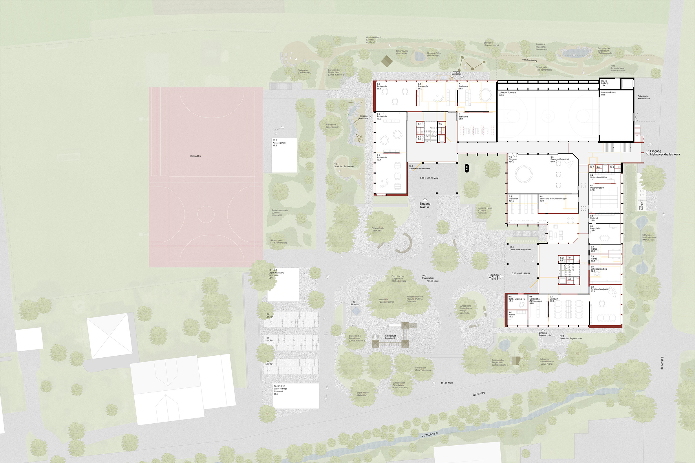 Das Erdgeschoss verbindet beide Trakte und beinhaltet alle weiteren Nutzungen. Die Tagesschule und die Basisstufe, am Fuss beider Trakte, verfügen je über einen direkten Zugang nach aussen. Die Neugestaltung des Nordzuganges schafft einen klaren Bereich für die mitunter auch öffentlich genutzte Aula und Mehrzweckhalle.