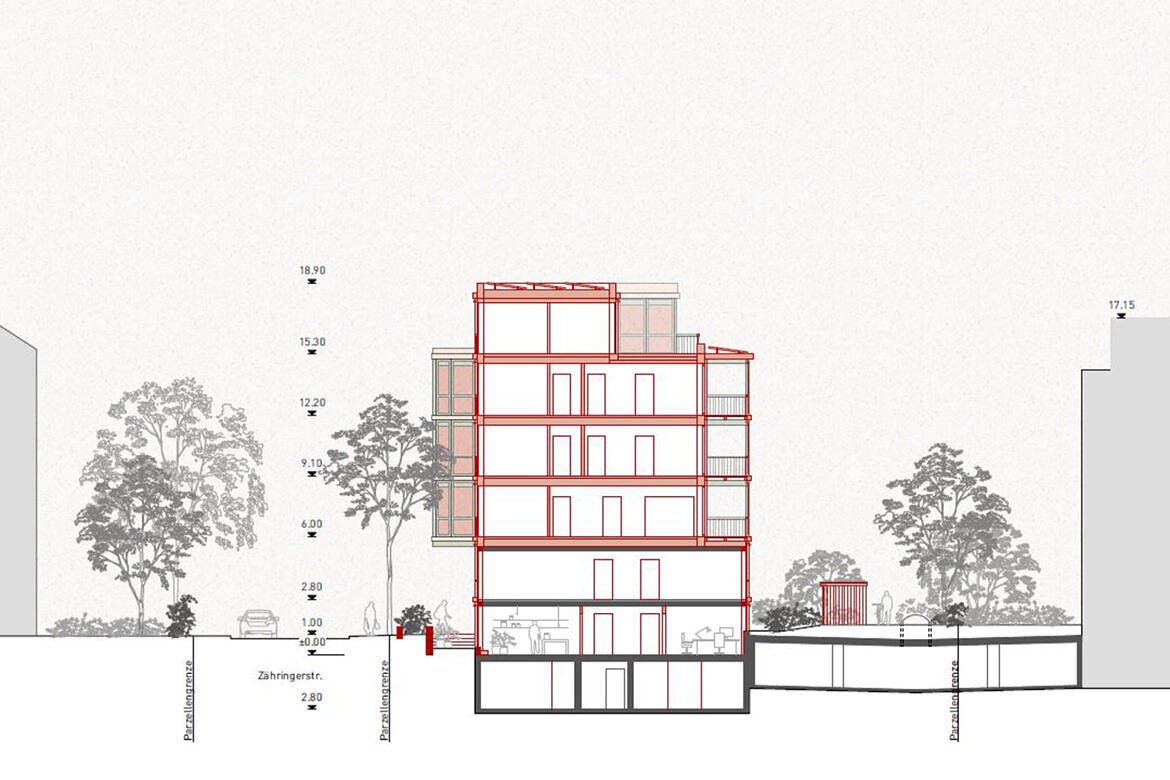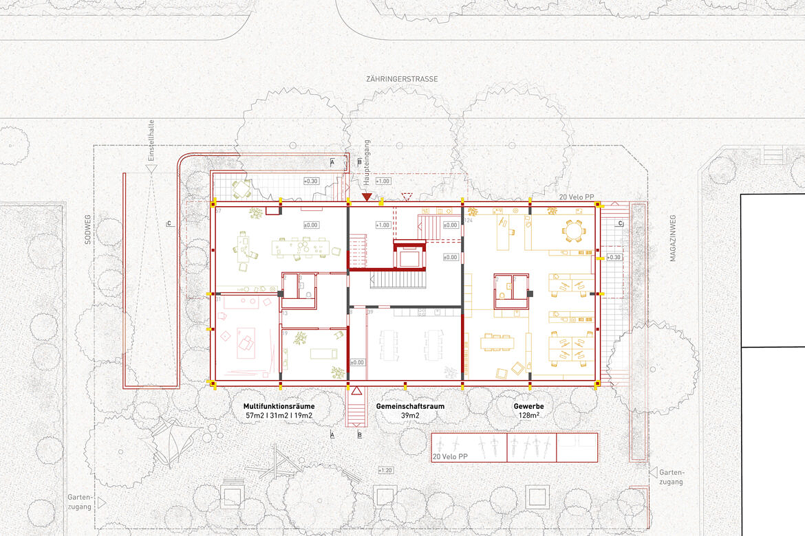 Das Erdgeschoss liegt rund ein Meter unter Strassenniveau. An der Zähringerstrasse und am Magazinweg werden zwei Bereiche mit einem vorgartenähnlichen Grünraum vom Strassenraum abgegrenzt. Diese Bereiche bilden eine geschützte Vorzone zu den im Erdgeschoss gelegenen Arbeitsräumen. Der Hauseingang wird auf Strassenniveau verortet und das öffentliche Leben bis an die Fassade gezogen. Zur Zähringerstrasse entsteht auf zwei Drittel der Fassadenlänge ein Vorplatz, der das Gebäude an der Strasse verankert. Eine neue Verbindung vom Treppenhaus zum Garten und den angrenzenden Gemeinschaftsraum aktivieren den Aussenraum im Südwesten und stärken die Kontakte im Haus.