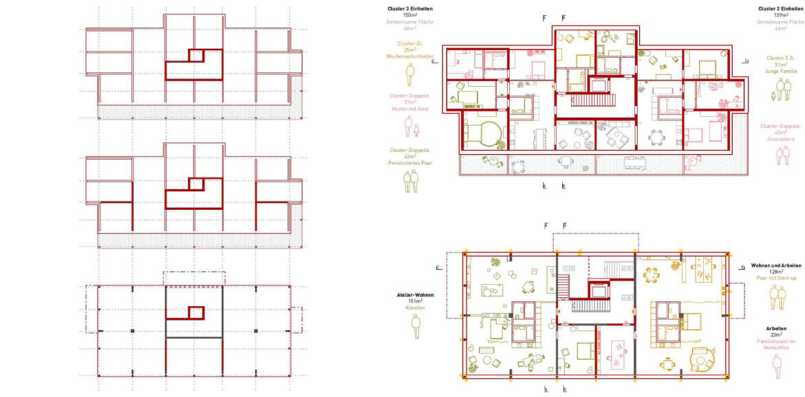 Der Rohbau wird im UG, EG und 1.OG bis auf die Fassadenstützen erhalten. Durch die klare Struktur und die angemessenen Raumhöhen ist der Erhalt dieser Geschosse sinnvoll. Die bestehende Betonstruktur und die neuen Geschosse mit vorfabrizierter Holzkonstruktion bilden eine bereichernde Vielfalt, sowohl in der Grundrissdisposition als auch in der atmosphärischen Wirkung der Wohnungen.