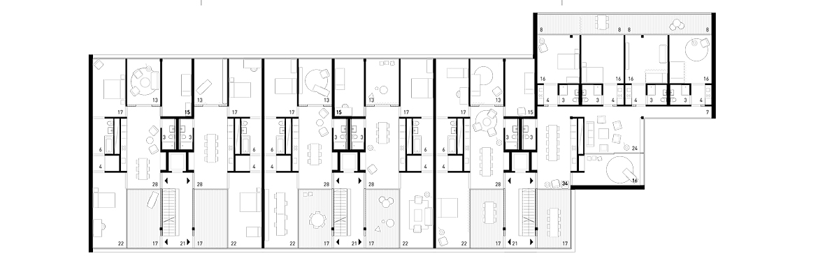 Entsprechend der Leitidee folgt das Gebäude der Typologie des Durchwohnens. Überhohe Geschosse verweisen auf den geschichtlichen Hintergrund des Ortes und reagieren gleichzeitig auf die Tiefe der Grundrisse. Eine eingezogene Loggia führt den Aussenraum weit in das Gebäude und schafft ein hohes Mass an Privatheit. Die Grundrisse organisieren sich um eine zentrale Wohnhalle mit Küche, eine effiziente Erschliessung innerhalb der Wohnung ist gewährleistet. Gleichwertige Zimmergrössen ermöglichen eine hohe Flexibilität in der Art der Belegung. Die Zimmer können als Wohn-, Arbeits- oder Schlafräume genutzt werden. Den Abschluss des Gebäudes zum Quartierplatz bilden zweiseitig orientierte Eckwohnungen.