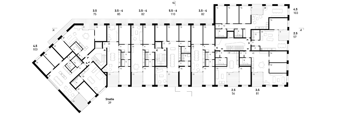 Innerhalb der Baustruktur mit ihren Konstanten aus Stützen, aussteifenden Kernen und Schächten offenbart sich eine Vielfalt an Wohnungsgrundrissen. Es entsteht urbanes Wohnen, mit klarer wohnungsinterner Zonierung zwischen Kollektiv- und Individualbereich. Die Erschliessung der Wohnungen erfolgt über deren Aussenraumzimmer oder direkt. Diese Dualität schafft nachbarschaftliche Beziehungen in das Treppenhaus und die Werkgasse, Gemeinschaft und Individualität prägen die Erschliessungsbereiche. Das Zentrum der Wohnung ist die übergross konzipierte Halle mit Ess- und Küchenbereich. Diese ist gross genug, um auch als Wohn- und Essküche genutzt zu werden. Alle Flächen sind nutzbar, auf Korridorfläche wird verzichtet. Mit überhöhten Geschossen und eingeschnittenen Aussenräumen wird die Belichtung der tiefen Grundrisse gewährleistet.