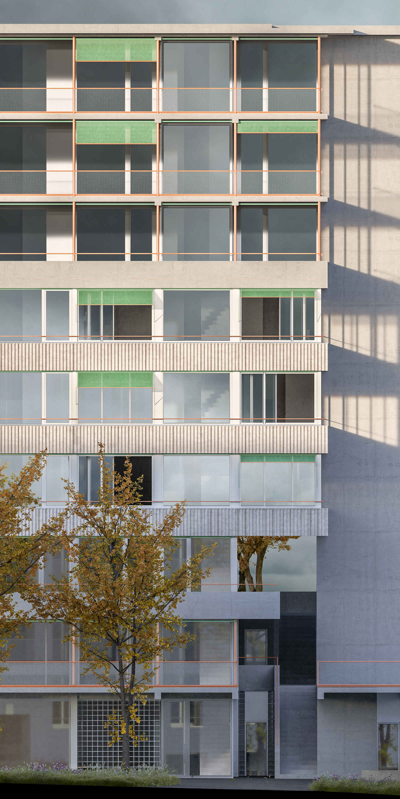 Der rohe Ausdruck bildet die Grundlage für das künftige, urbane Leben. Dieser Charme wird Innen und Aussen zelebriert. Durchgänge, Laubengänge, Treppenhäuser, Öffnungen und Verengungen bilden die atmosphärische Dichte der Gemeinschaft, ohne den einzelnen Bewohnern diesen Grundgedanken aufzuzwingen. Glasbausteine schaffen die Beziehung unter den Individual- und Kollektivflächen. Entlang der Werkgasse sind die Zugänge angeordnet, diesen direkt angeschlossen sind gemeinschaftliche Flächen für Wäsche und Gewerbe.