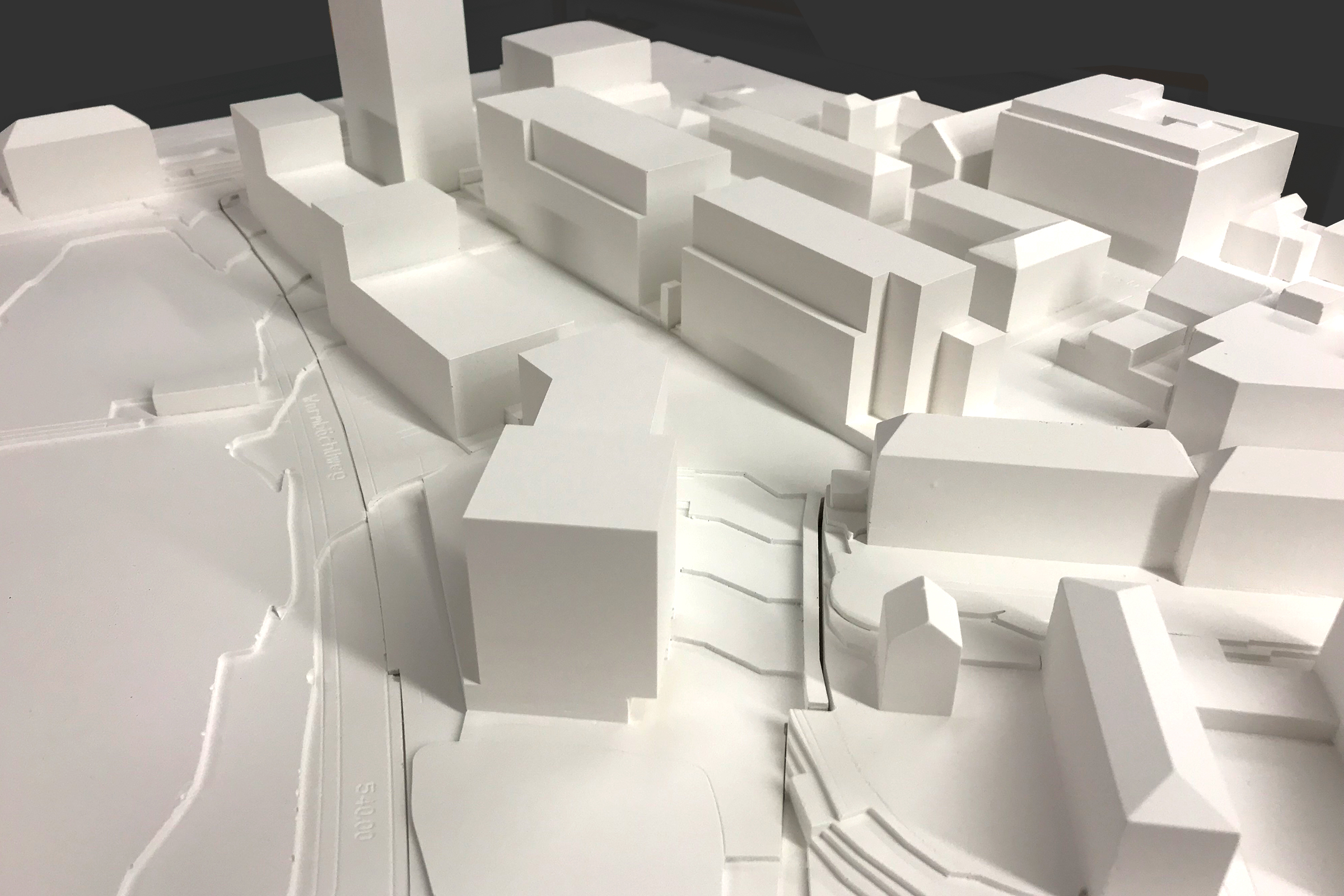 In Anlehnung an die industrielle Vergangenheit entwickelt das städtebauliche Thema einfache, zusammenhängende Volumen. Der geknickte Baukörper reagiert auf die Erschliessungszone der Werkgasse und schafft volumetrisch einen klaren Auftakt zum Quartierplatz. Entsprechend der städtebaulichen Leitidee zeichnet der Rücksprung die Körperlichkeit der einzelnen Volumen aus und passt sich damit der Körnigkeit der benachbarten Bauten an.