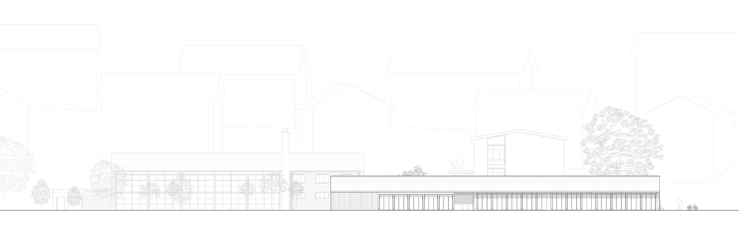 Um der Kraft und Eleganz der Bestandesbauten ein Gegenüber zu stellen, werden der Mehrzweckraum und die Kindergartennutzung unter einem durchlaufenden Satteldach platziert. In der Grundrissproportion lehnt sich der Neubau seinen Vorgängern an, in der Geschossigkeit bleibt er jedoch klar untergeordnet. Die volumetrische Komposition bildet ein stimmiges Ensemble.