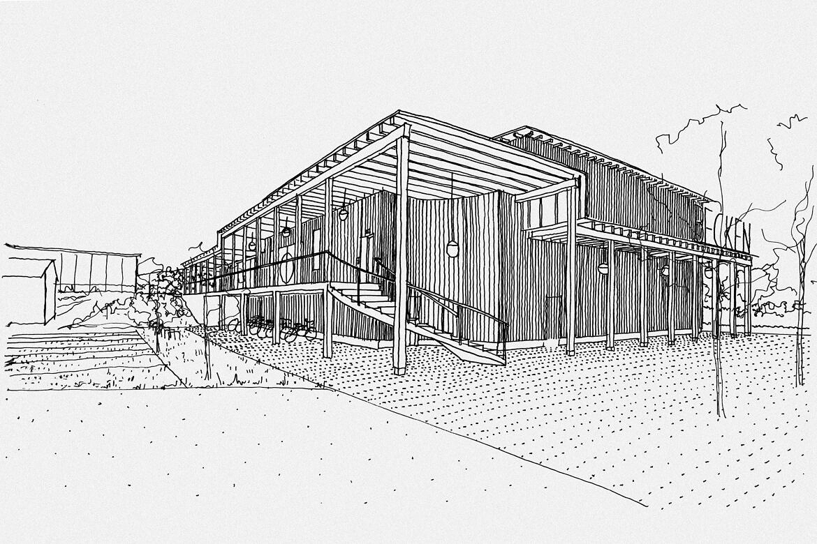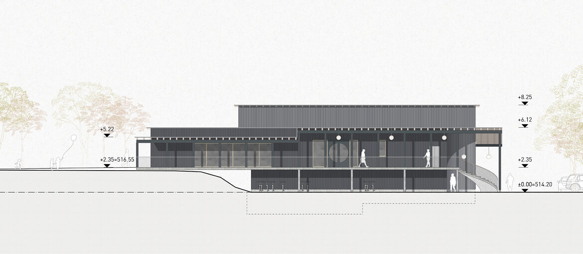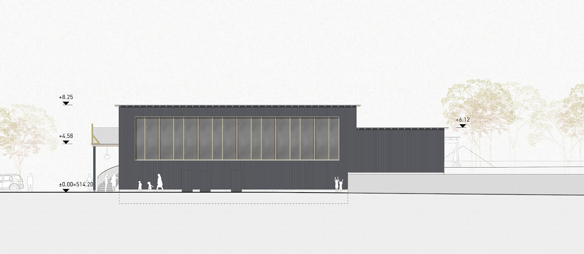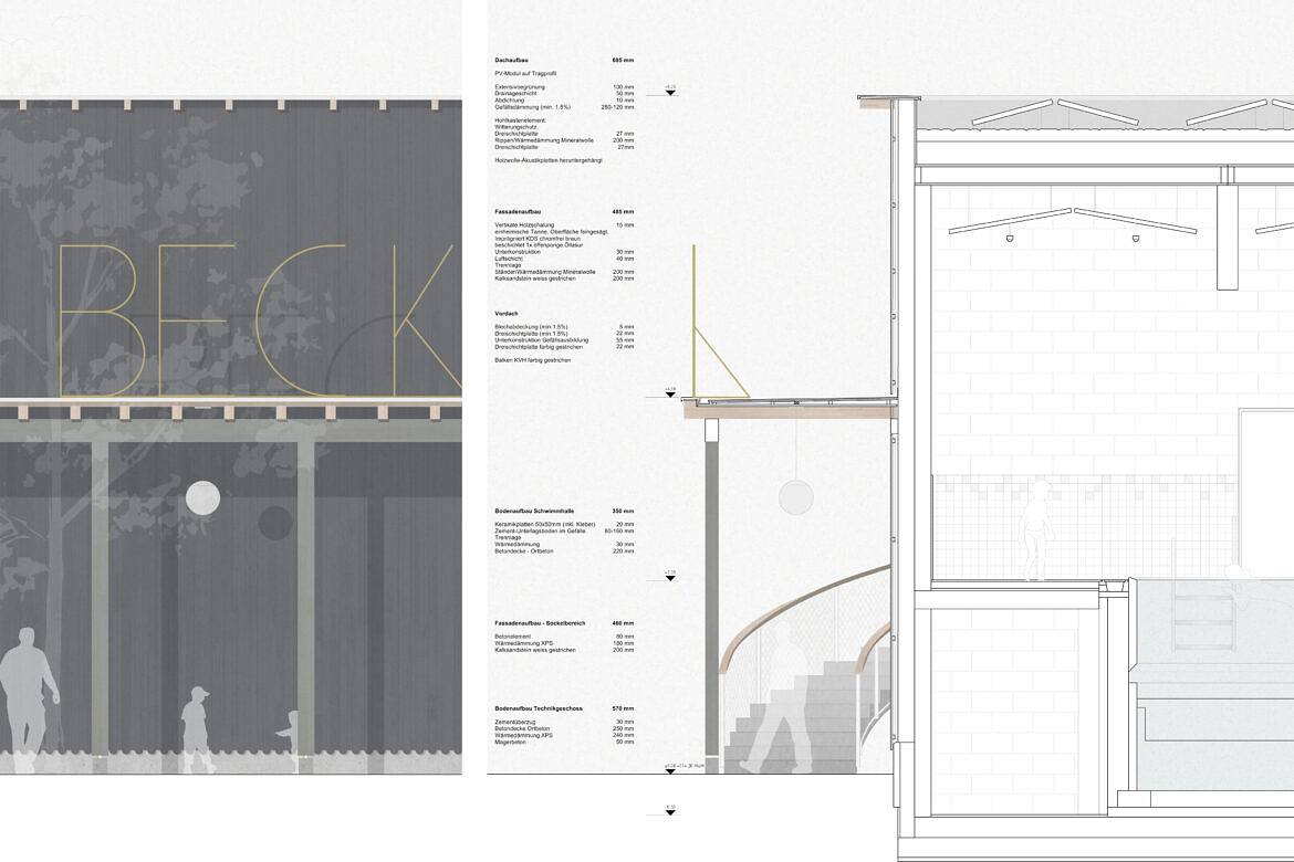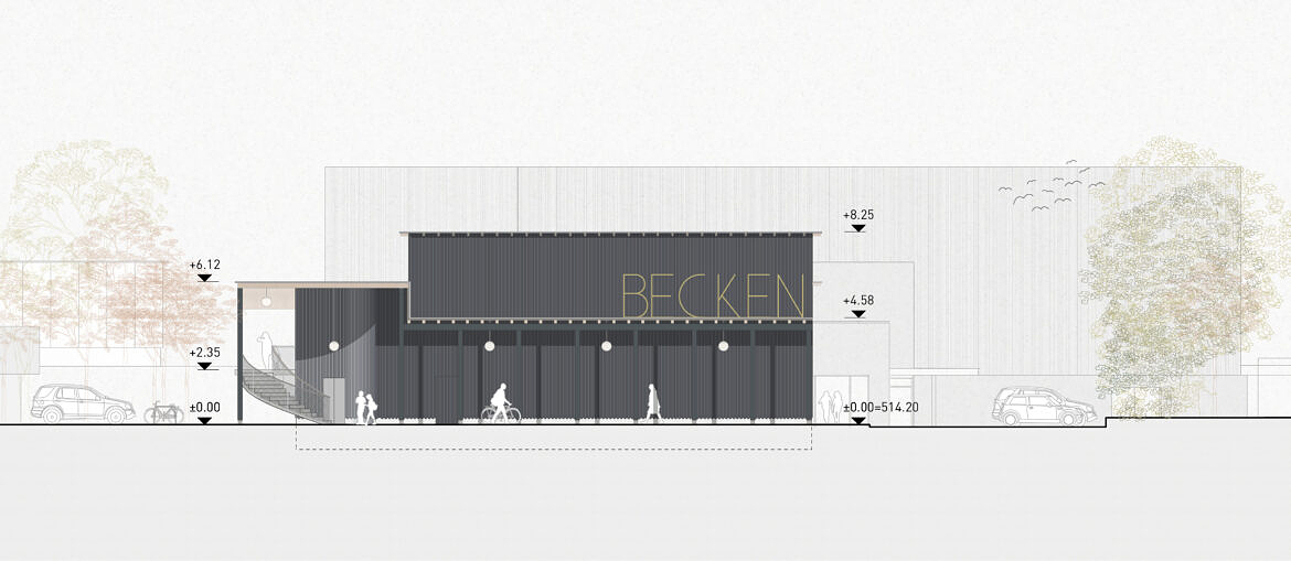 Das neue Lehrschwimmbecken nimmt mit seiner Setzung und im Ausdruck Bezug auf die Mehrfachturnhalle. So werden die zwei, auch öffentlich genutzten Sportanlagen zu einem lesbaren Ensemble mit einer klaren Zugangsachse zusammengefasst. Die Fassade wird mit einer vertikalen dunklen und durchgehenden Holzschalung verkleidet.