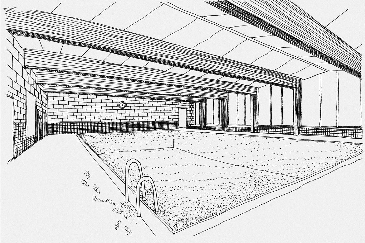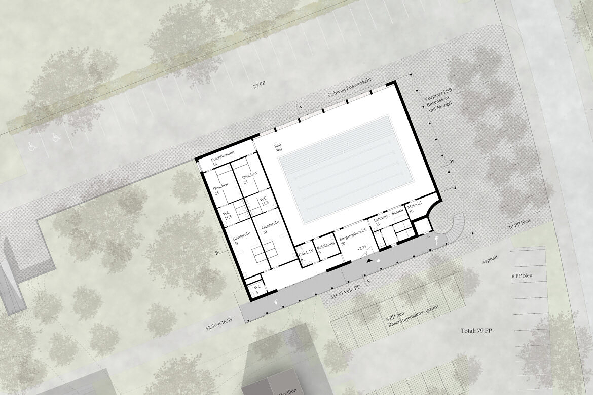 Von der Strasse her markiert die geschwungene Treppe den Auftakt zur Zugangsgalerie. Das Vordach begleitet den Besucher vom Parkplatz oder vom Pausenplatz bis zum Haupteingang. Von dort betritt man die Eingangshalle und Garderoben im Obergeschoss. Die Technikräume sind um das Becken im Erdgeschoss angeordnet. Die Erschliessung wird im Aussenbereich zelebriert, zugleich im Inneren reduziert, was zu effizienten Gebäudeabmessungen führt.
