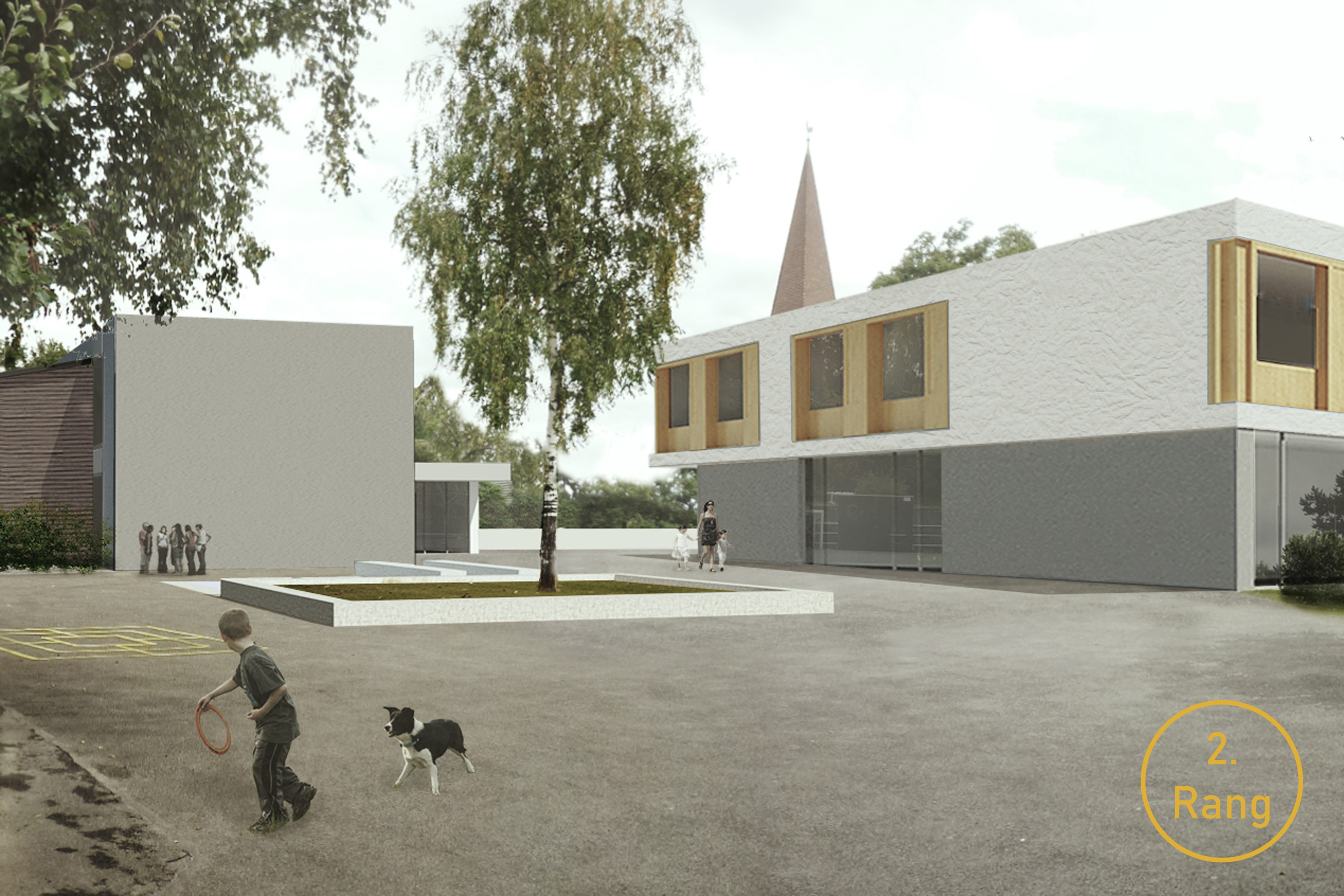 Zur Schulanlage hin orientiert befindet sich schliesslich die Administration der Schule. Unterhalb der Eingangsebene sind drei Gestalten-Räume mit dazugehörenden Nebenräumen angeordnet. Auch hier kann für gewisse Arbeiten der angrenzende Pausenhof während dem Unterreicht genutzt werden. Der westliche Pausenraum ist Rückzugsort für die Basisstufe. Die bestehende Topografie und der Baumbestand bieten Schutz und Geborgenheit. Der mittig gelegene Pausenraum ist der Pausenhof im eigentlichen Sinne. Sämtliche vier Schulgebäude schliessen an diesen Hof an und bilden so den Aussenraum. Der dritte Pausenraum liegt auf der Ostseite. Anstelle der heutigen Böschung tritt die Fassade des Erweiterungsbaus mit den Gestaltungszimmern. So wird der Raum neu klar definiert.