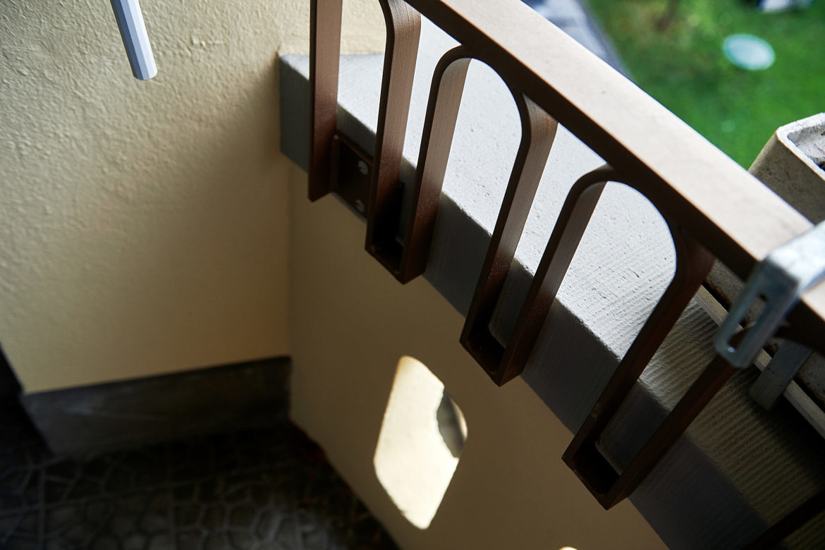 Die Balkonbrüstung sowie auch die Brüstungen bei den drei Loggien wurden ebenfalls den heutigen Vorschriften angepasst. Die bestehende Fassade erhielt eine Reinigung, hohle Stellen wurden geflickt und die ganze Fassade gemäss Rekonstruktion in den Originalfarben gestrichen.