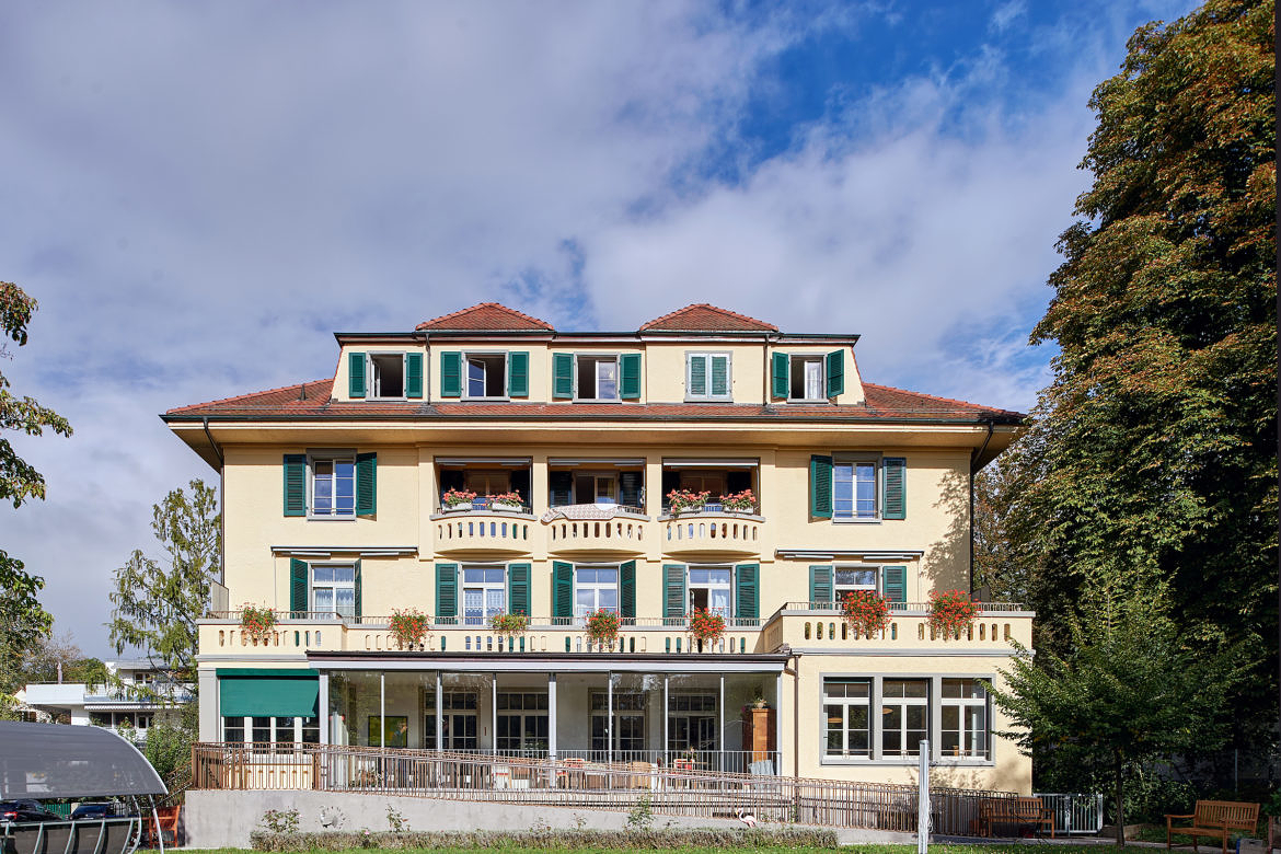 Das alte Herrschaftshaus am Brunnadernrain in der Elfenau wurde 1913 als Lehranstalt für junge Frauen, als sogenanntes «Töchterinstitut Dr. Fischer», erstellt. Heute wird die Anlage als Kompetenzzentrum Demenz betrieben. Im Innern erneuerten wir die Steigleitungen und Sanitärbereiche der Zimmer unter laufendem Betrieb. Aussen erstellten wir einen neuen, hindernisfreien Zugang und brachten die Fassaden zu neuem Glanz.
