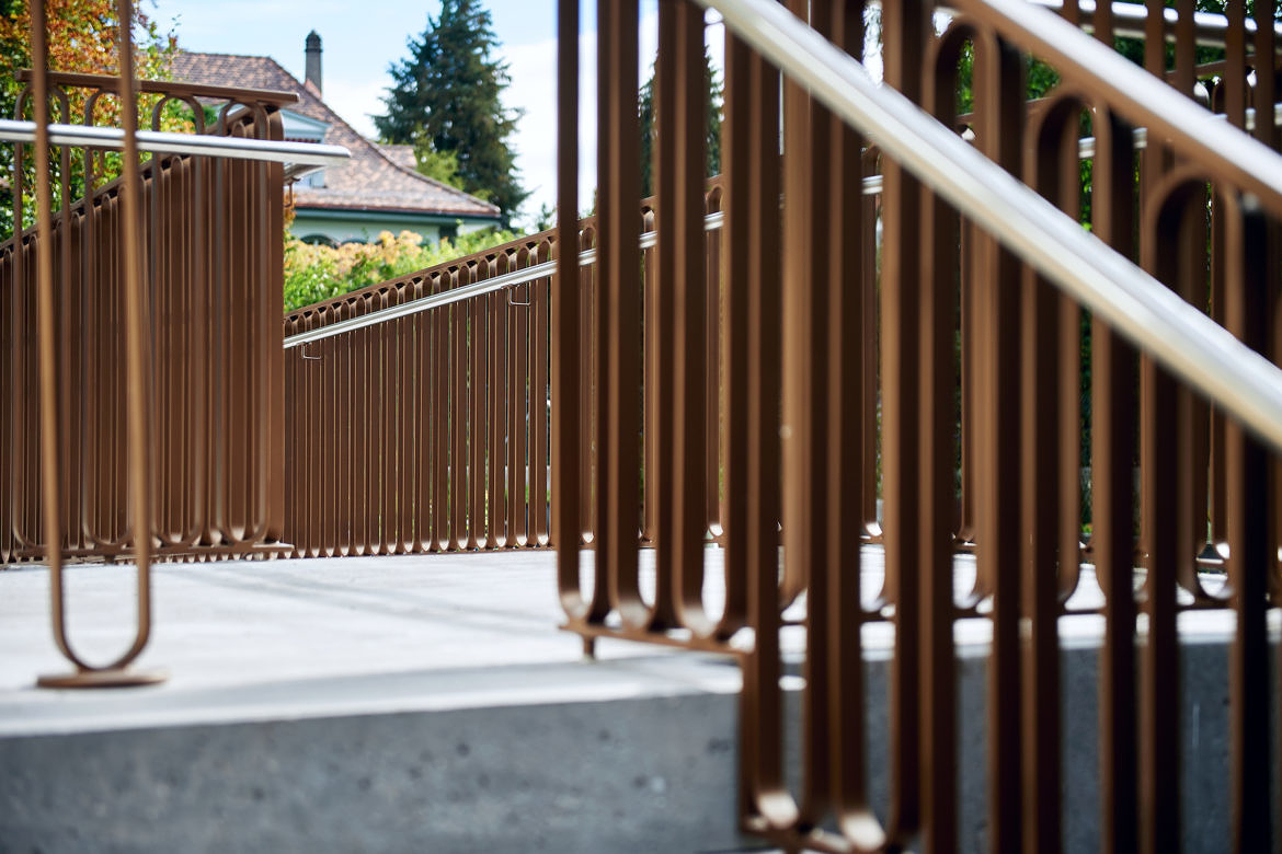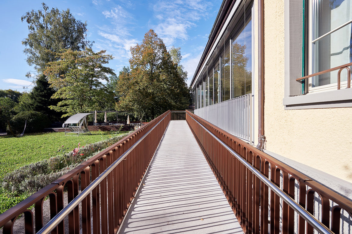 Es bestehen zwei Zugänge, die mit Treppenliften bedient werden. Im Sommer sind der Garten und die neu gestaltete Terrasse stark frequentiert. Dies ist mit hohem betrieblichem Aufwand verbunden, da viele Bewohner nicht in der Lage sind, Treppen zu steigen und die Treppenlifte viel Zeit beanspruchen. Eine neue Rampe entlang der Südfassade schafft Abhilfe; Sie erlaubt den Bewohnern, eigenständig oder in Begleitung die Gartenanlage hindernisfrei zu erreichen. Das Geländer nimmt die Formensprache der bestehenden Betonbrüstungen und der neuen Absturzsicherungen auf.