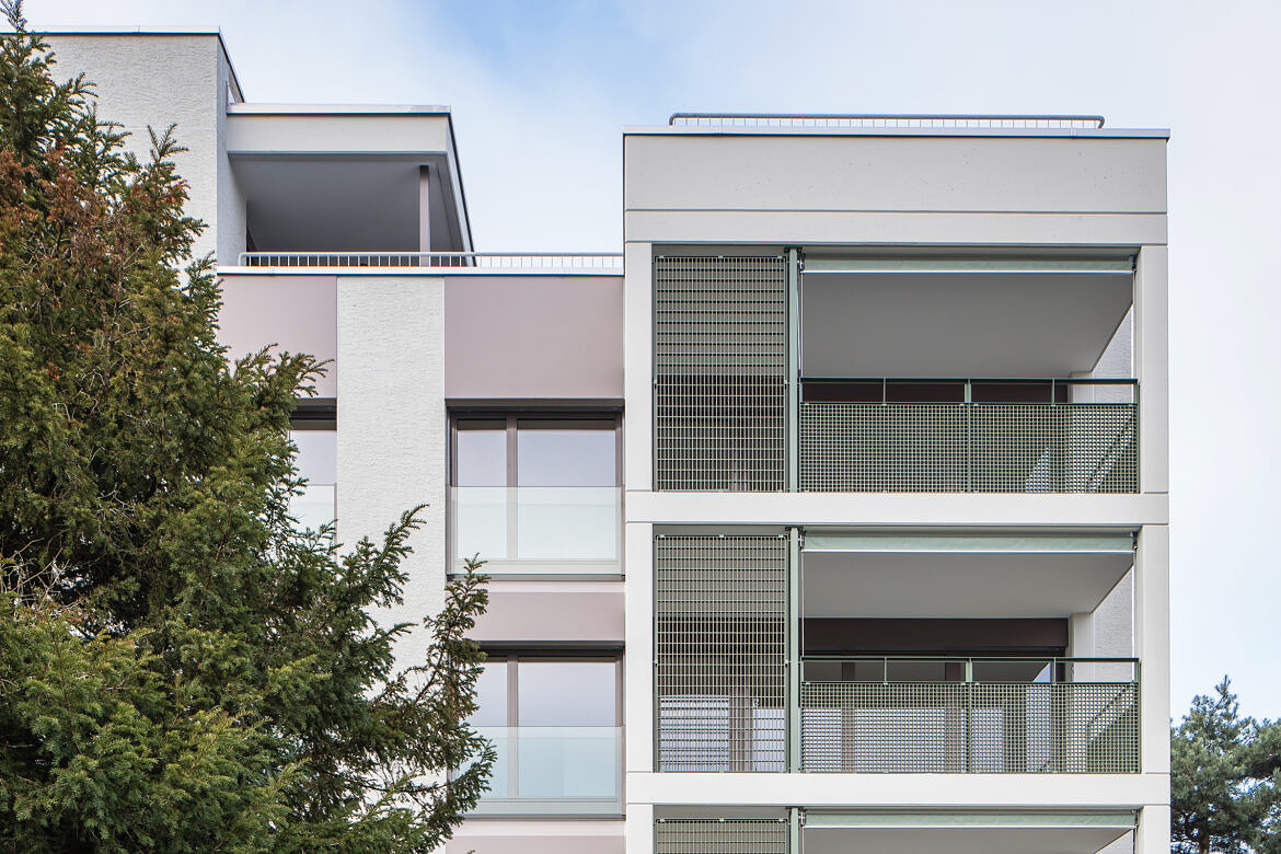 Die Grundfarbe Grün des Bestands wird auch nach der Sanierung das Fassadenprägende Element sein. Die moosgrünen GFK-Gitterroste bei den Balkongeländern bilden eine Referenz an die ursprünglichen Stahlgitter, welche aus Sicherheitsgründen ersetzt werden mussten.