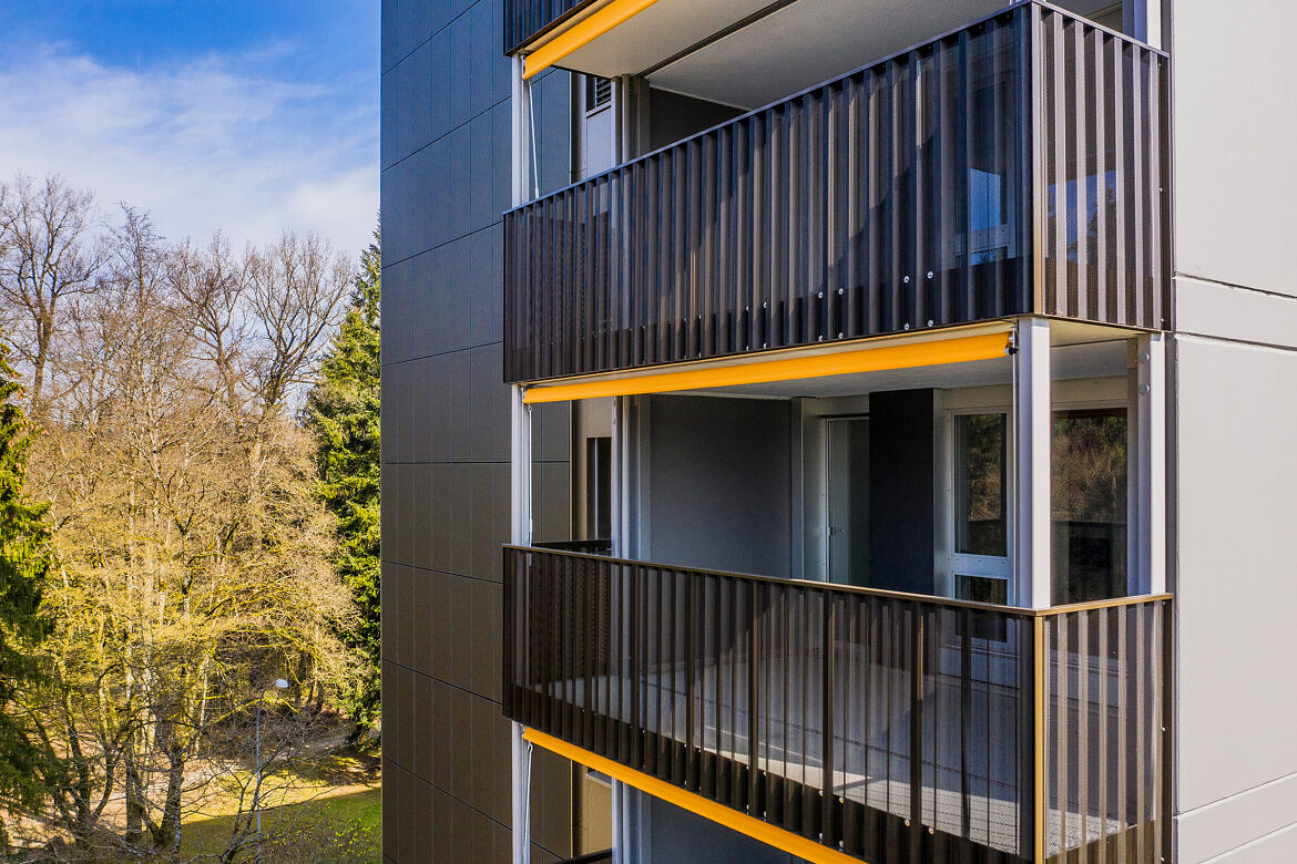 Sie erhielten eine hindernisfreie Dusche und die Liftanlage wird so ersetzt, dass sich die Haltestellen des Lifts neu auf jedem Wohngeschoss befinden. Das sechste Geschoss, welches sich bereits im Bestand an der Nordfassade als Besonderheit abgezeichnet hat und Einzimmerwohnungen beinhaltete, wurde neu eine Cluster-Wohnung mit sechs Einheiten. Die Cluster-Wohnung wird durch ein benachbartes Wohnheim gemietet und bietet Menschen mit unterschiedlichen Handicaps die Chance, selbstständig zu wohnen.