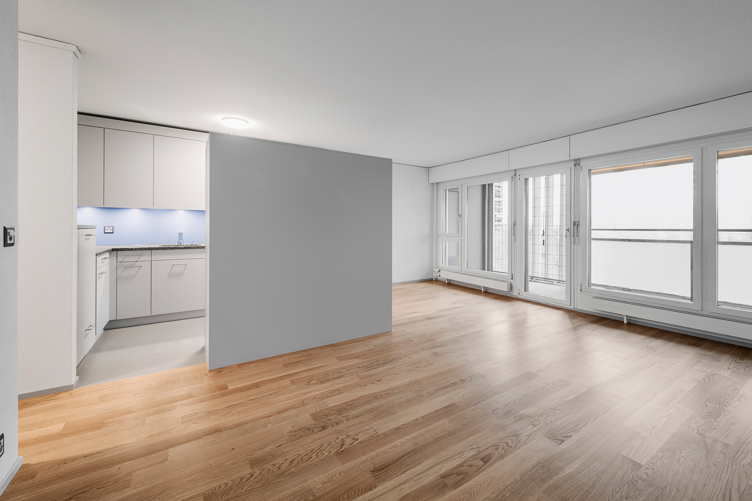 Die Kopfwohnungen im Westen erweitern wir um die bestehenden Einzimmerwohnungen, so entstanden neue grosse Familienwohnungen mit offenen Wohnküchen. Die Standardwohnungen blieben in der Anordnung unverändert, einzig die Wohnungen im Haus 13 wurden als Alterswohnungen konzipiert.
