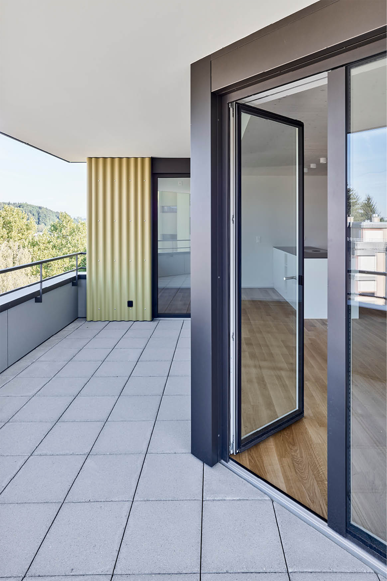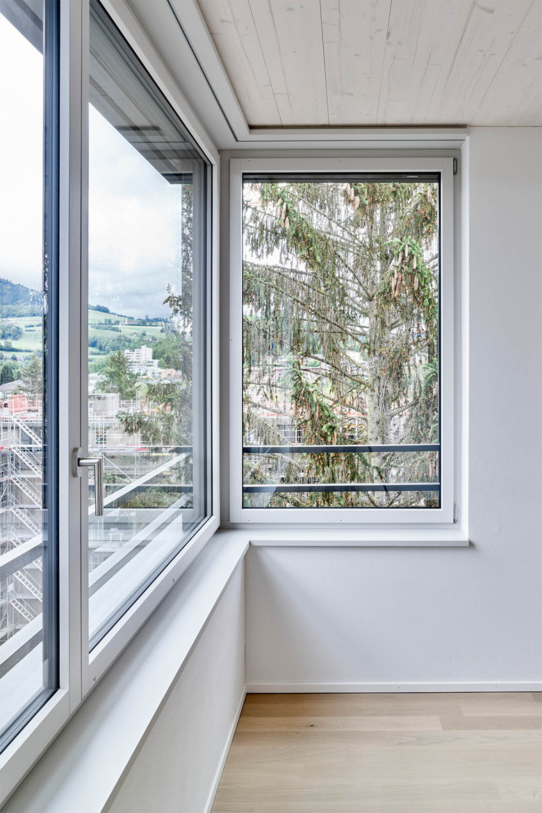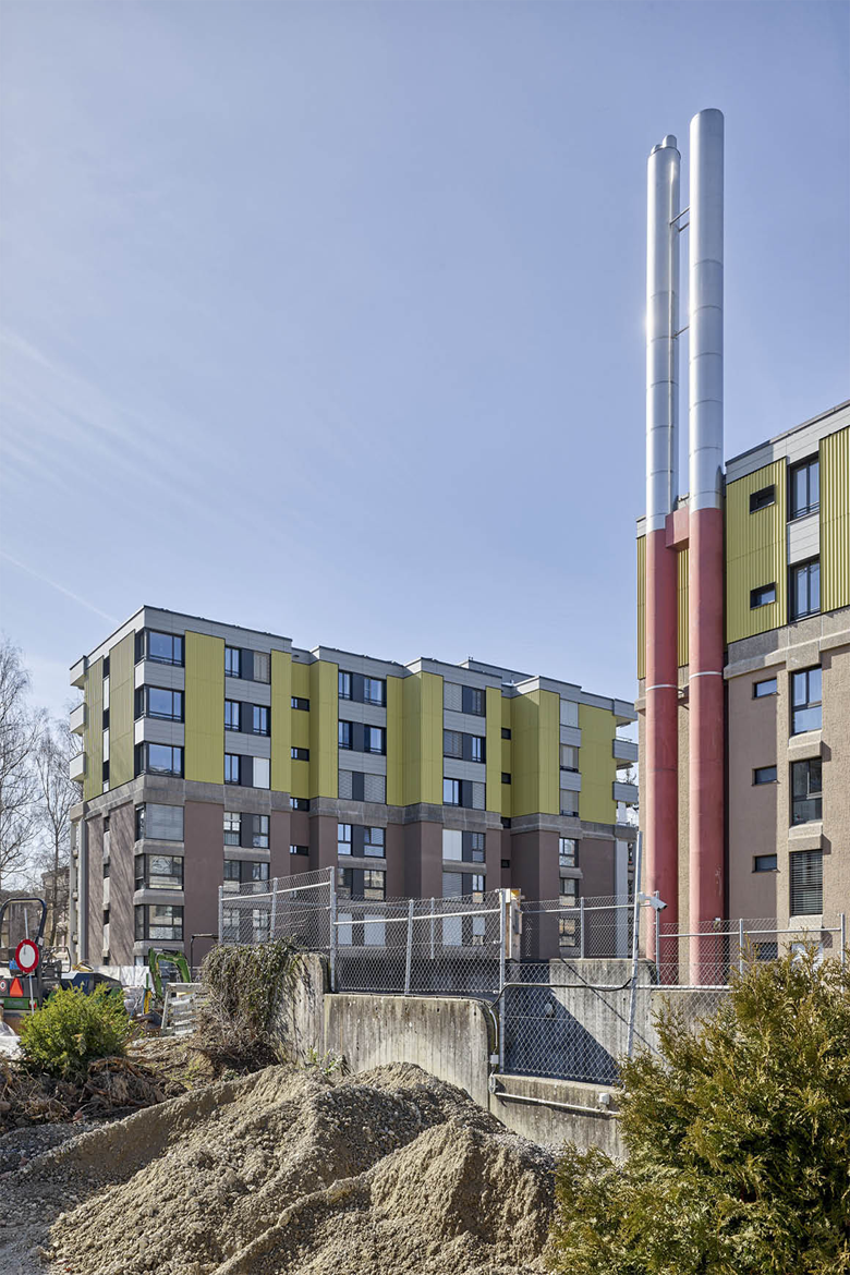 Die neuen Aufbauten in Holzelementbauweise zeichnen sich durch eine eigenständige Farbigkeit aus, wobei sich die vertikalen, lindgrünen Fassadenbänder zu mittelgrauen Brüstungen und Dachabschlüssen differenzieren.