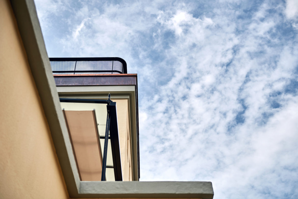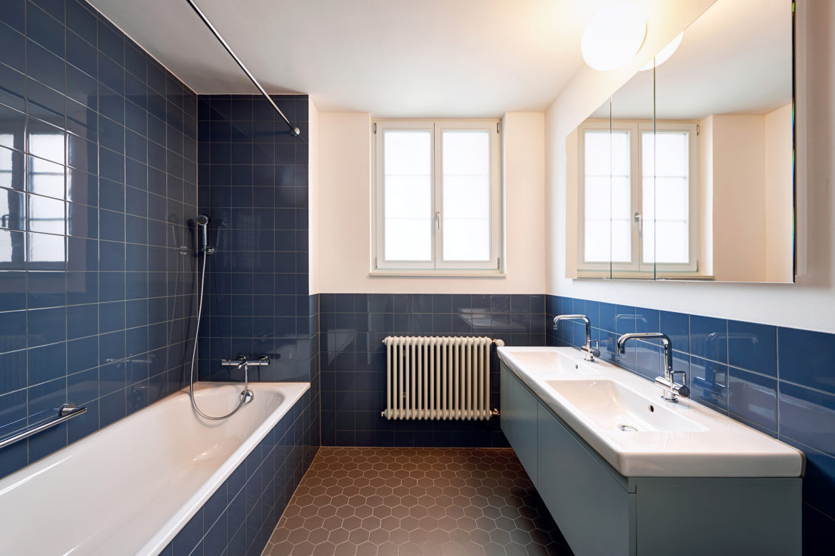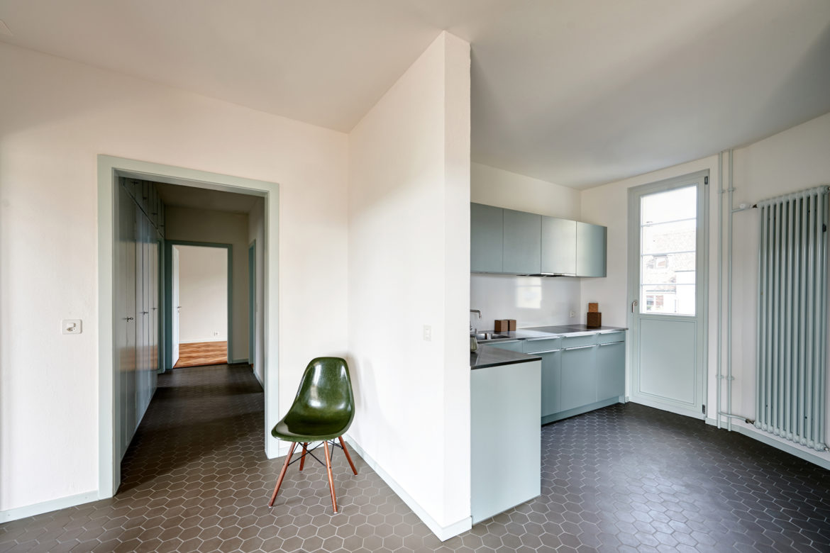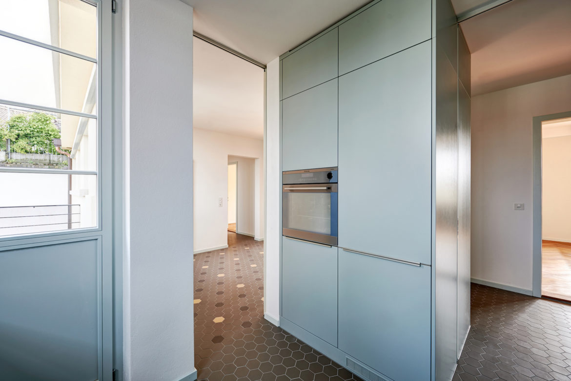 Kleine Details zeichnen den Umgang im Bestand aus – so wurde zum Beispiel die in der Schaufensterfront integrierte Ausstellstore im Gewerberaum repariert, fehlende Teile nachgebaut und der Antrieb wieder gangbar gemacht. Die wiedergewonnene Farbigkeit im Treppenhaus und in den Wohnungen, die feine farbliche Zäsur in den Wohnräumen, sowie die Wahl der keramischen Oberflächen folgen dem entwickelten Sanierungskonzept. Hofseitig erhalten die Wohnungen grössere Balkone, welche den Ausdruck des Gebäudes aufnehmen. Das Attikageschoss erfährt eine grundlegende Erneuerung. Das architektonische Konzept verfolgt eine klare Trennung zu den Regelgeschossen und bildet den neu gewonnenen Wohnraum formal als Neubau ab.