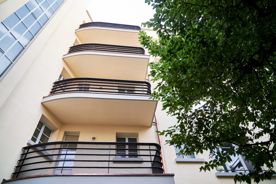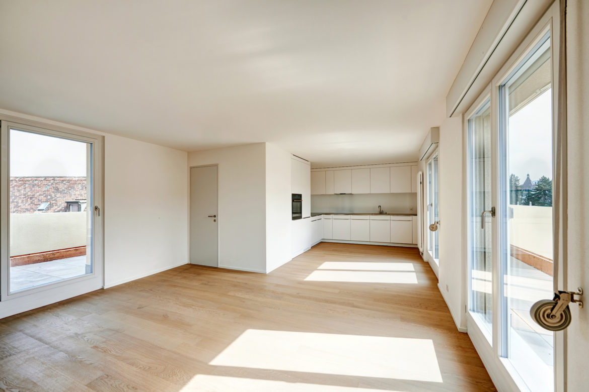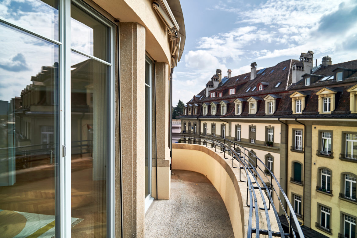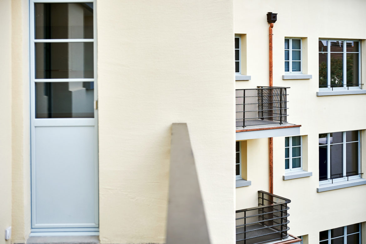 Kleine Details zeichnen den Umgang im Bestand aus – so wurde zum Beispiel die in der Schaufensterfront integrierte Ausstellstore im Gewerberaum repariert, fehlende Teile nachgebaut und der Antrieb wieder gangbar gemacht. Die wiedergewonnene Farbigkeit im Treppenhaus und in den Wohnungen, die feine farbliche Zäsur in den Wohnräumen, sowie die Wahl der keramischen Oberflächen folgen dem entwickelten Sanierungskonzept. Hofseitig erhalten die Wohnungen grössere Balkone, welche den Ausdruck des Gebäudes aufnehmen. Das Attikageschoss erfährt eine grundlegende Erneuerung. Das architektonische Konzept verfolgt eine klare Trennung zu den Regelgeschossen und bildet den neu gewonnenen Wohnraum formal als Neubau ab.