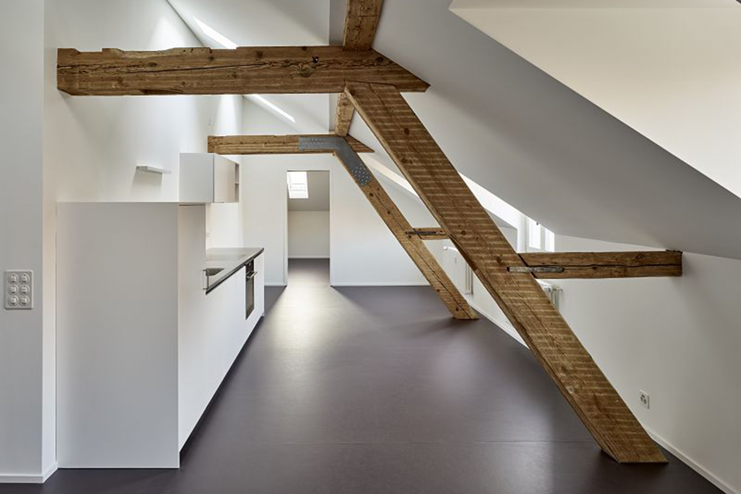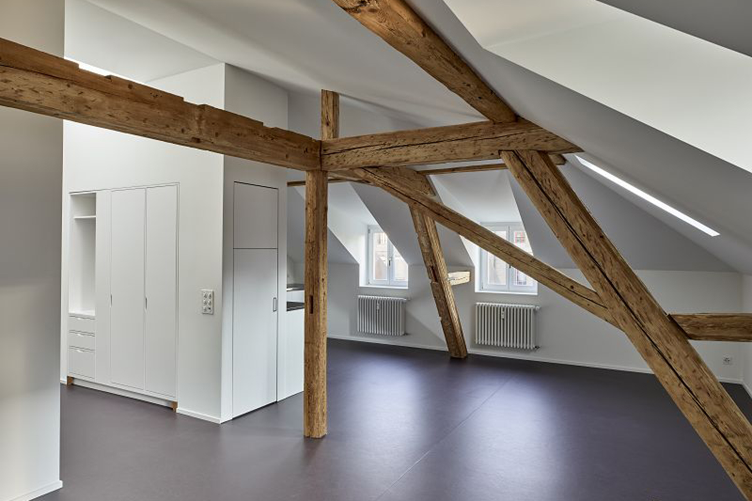 Auf Basis historischer Pläne rekonstruierten wir die ursprüngliche Grundrisstypologie: Auf der Eingangsseite waren Nasszelle und Küche angeordnet, gegen die repräsentative Südseite die Wohn-, Arbeits- und Schlafräume. Wir wollten das Gebäude in seine ursprüngliche Struktur zurückzuführen. Der Küchenanbau sowie kleinteilige Einbauten entfernten wir. Mit einer sorgfältigen Spurensuche fügten wir historische Fragmente zusammen und es zeigte sich immer deutlicher ein Gesamtbild des einstigen Zustandes. Die Eingriffe in den drei Wohngeschossen ordnen sich in die historische Architektursprache ein, neue Raumsequenzen werden analog den Bestehenden miteinander verbunden. Bestehende Bauteile wurden repariert und weiterverwendet oder mit handwerklicher Raffinesse wieder hergestellt. Das grossräumige Dachgeschoss gewährte ideale Voraussetzungen für den Einbau von zwei kleineren Wohnungen. Die Eingriffe heben sich deutlich vom Ursprünglichen ab, schaffen aber mit dem sichtbaren Gebälk den historischen Bezug. Die nordseitige Erdgeschossfassade wurde rekonstruiert und in beeindruckender handwerklicher Präzision wiederhergestellt. Einzelne Bauteile aus dem Lager der Denkmalpflege vervollständigen das Gebäude in seiner historischen Erscheinung.