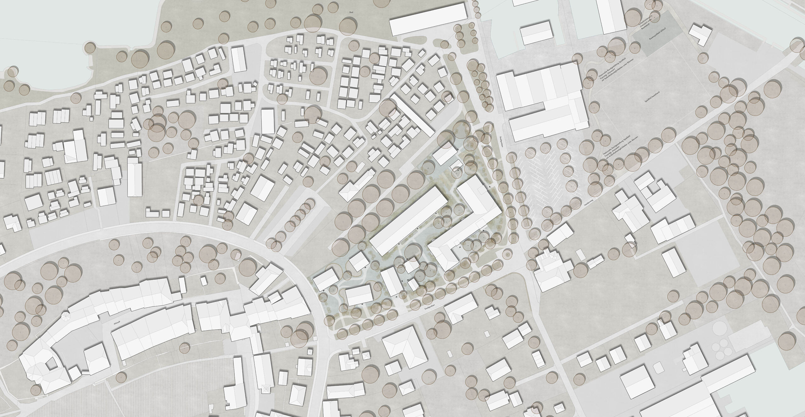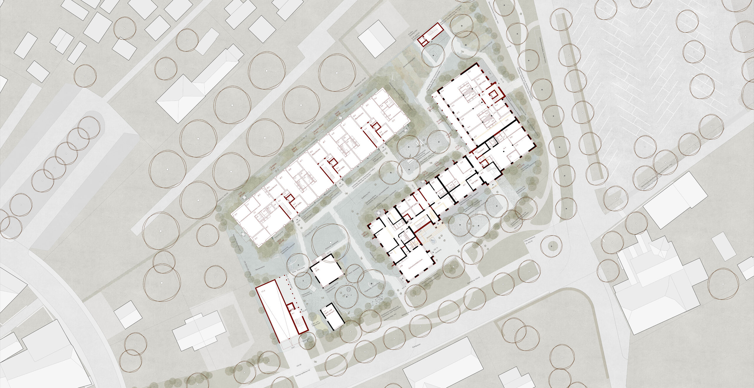 Das bestehende Gravure Gebäude steht an einem gemeinschaftlichen, baumbestandenen Vorplatz. Die mineralische Ausgestaltung dieses Platzes unterstreicht den industriellen Charakter und steht im Kontrast zum grünen Hof. Dieser spannt einen durchfliessenden Grünraum zwischen den Baukörpern auf und bindet so neu und alt zusammen. Der daraus entstehende Freiraum schafft eine Diagonalbeziehung und bettet darin die kleineren Bauten ein. Ein feines Wegnetz führt zum Ensemble rund um die Kita in der erhaltenswerten Villa, zu den Eingängen des Neubaus am Hof und schliesst auch das Bestandesgebäude über Nebeneingänge an.