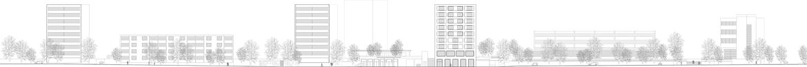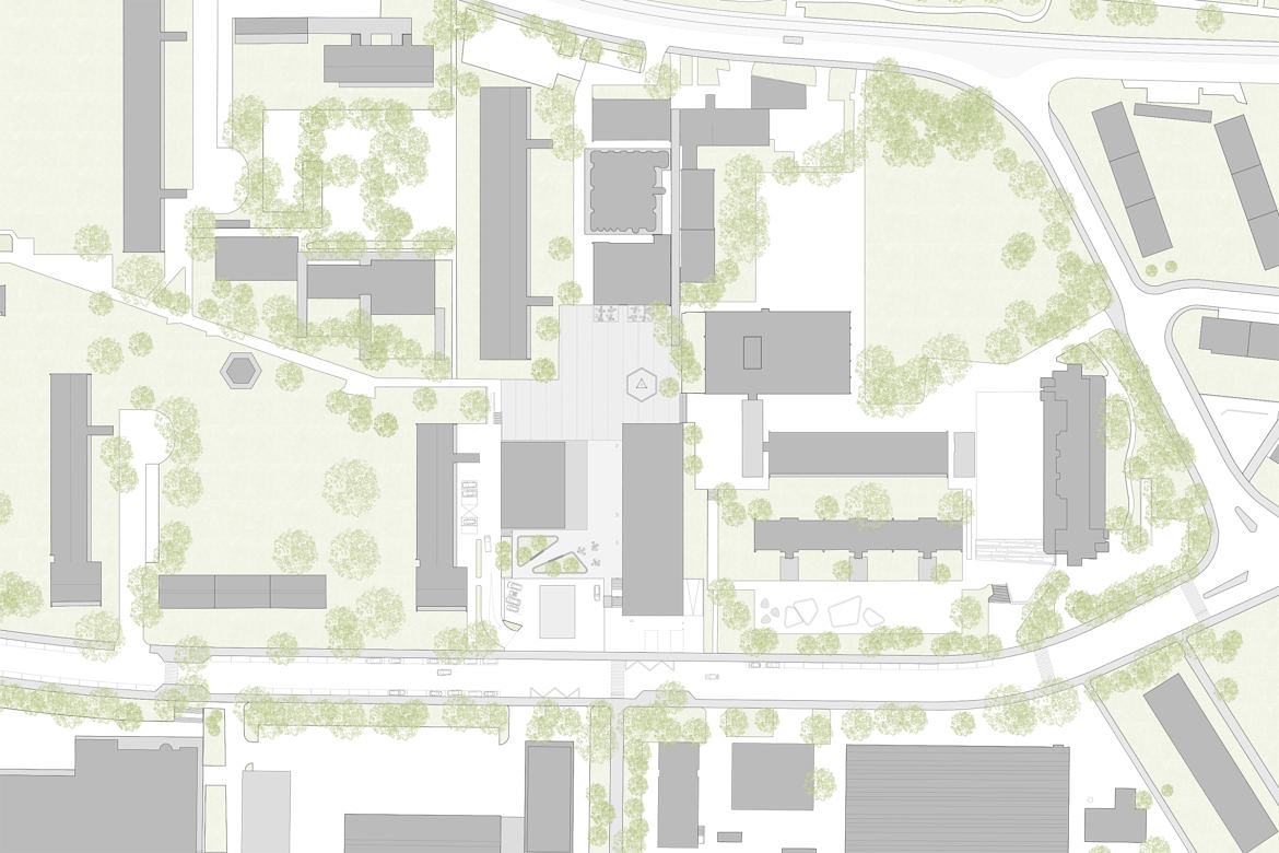 Die Bebauungsstruktur wird mit einem Scheibenhaus weitergeführt, die Höhenentwicklung entspricht dabei den bestehenden Scheibenhäusern entlang der Fellerstrasse. Mit der Setzung an den östlichen Parzellenrand spannt sich zwischen Fellerstrasse 30 und dem Neubau ein weiterer, frei zugänglicher Raum auf. Dieser wird mit einem eingeschossigen Bau analog der bestehenden Infrastrukturbauten bespielt.