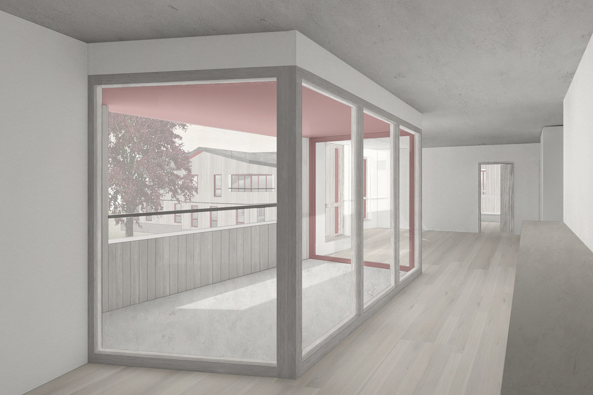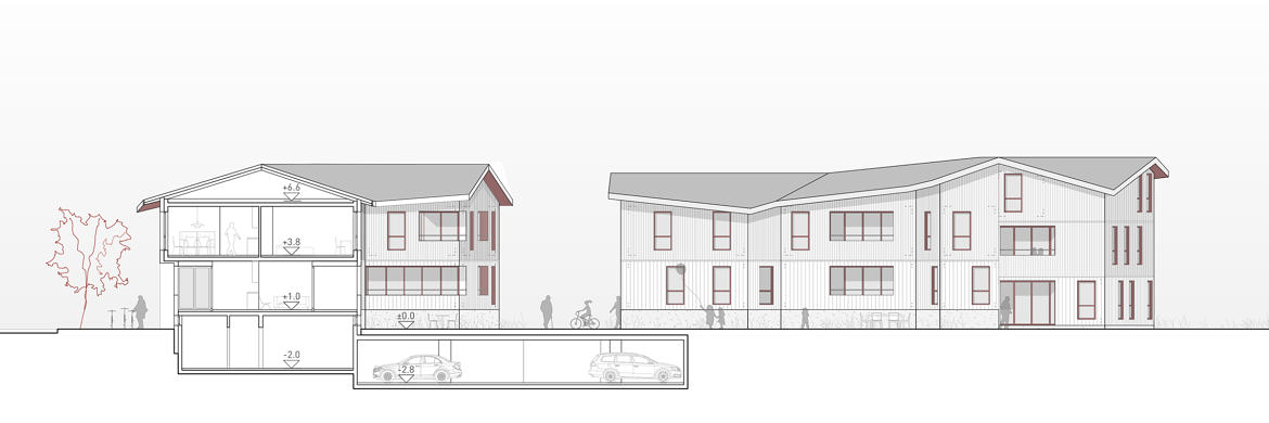 Damit der Aussenraum nicht einzelnen Einheiten zugeschrieben wird, sind die Wohnungen im Erdgeschoss als Hochparterre geplant. Die neuen Baukörper weisen Einschnitte und Nischen auf, die eine Verzahnung zwischen Aussenraum und den neuen Volumen bilden. Der so entstehende Raum wird intimer, je näher man der Fassade kommt. So profitieren alle Wohnungen von der grosszügigen Aussenanlage, ohne die Privatsphäre einzelner Mieter einzuschränken. Identitätsbildend für den Aussenraum wird die Blutbuche erhalten und als wichtiger Bestandteil der neuen Umgebungsgestaltung geschützt.