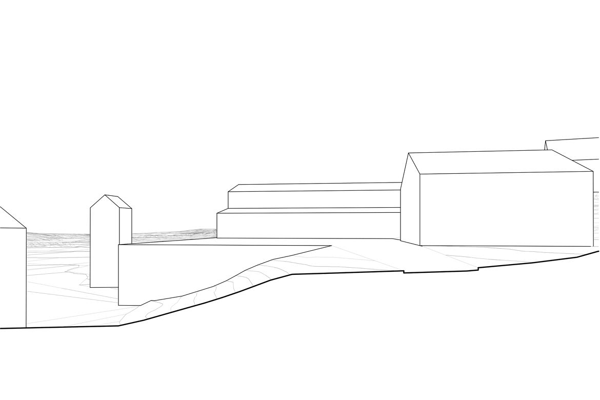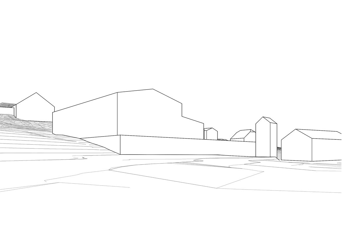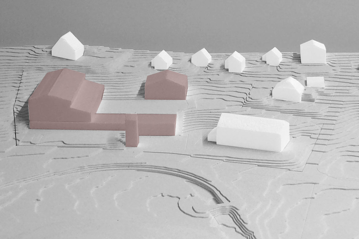 Die Erweiterung des bestehenden Werkhof- und Feuerwehrgebäudes im Sockelgeschoss stärkt deren Präsenz zur Kantonsstrasse. Die Neubauten für die Mehrzweckhalle und die Gemeindeverwaltung sind als solitäre Bauten von der Strasse zurückversetzt, aber bedingt durch die topografische Ausgangslage präsent situiert. Das Neubauvolumen der Mehrzweckhalle schafft einen klaren Abschluss vom Siedlungs- zum Landschaftsraum, seine Dimension signalisiert die öffentliche Nutzung. Die beiden in der Höhe differenzierten Neubauvolumen schaffen einen grosszügigen, öffentlichen Vorbereich mit Sichtbezügen in den Landschaftsraum. Schrägdächer führen die ortstypische Dachform weiter. Die Gesamtanlage mit dem zentralen Gemeindeplatz bildet eine atmosphärische Einheit mit einem hohen Mass an Identität. Die klare Gestaltung der Umgebungsfläche wertet die Zugangssituation auf.