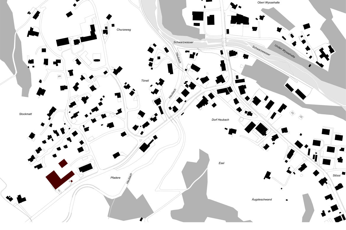 Die Gemeinde Rüschegg besteht aus den Dörfern Gambach, Hirschhorn, Graben und Heubach. Die vorgefundene Typologie des Ortes Heubach ist geprägt durch lose gesetzte Bauten. Die Streusiedlung ist durchsetzt mit grösseren, zum Teil öffentlichen Gebäuden. Diese Bebauungsstruktur ist ein wesentlicher Punkt für die Entwicklung des ortsbaulichen Themas.