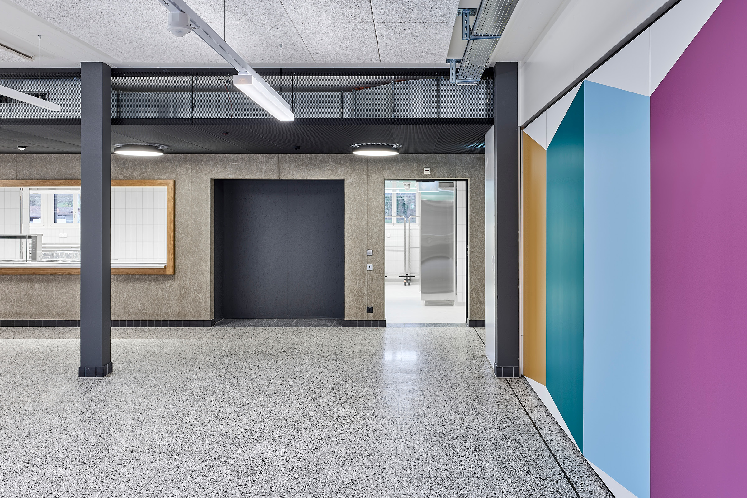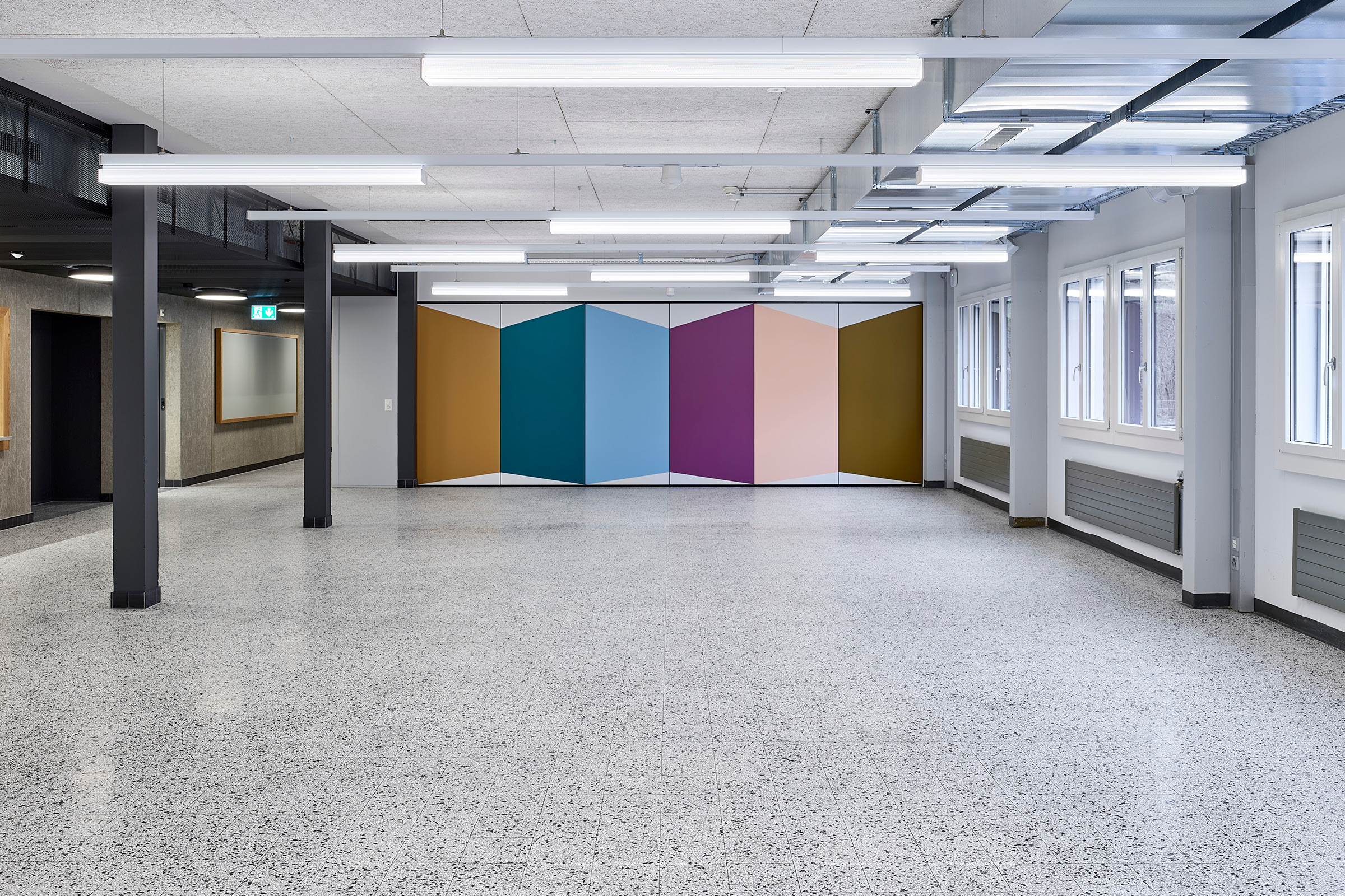 An den beiden Enden des grossen Essraums finden sich neue Wände. Die nordseitige Wand verkleidet die Haustechnikinstallationen als Vorwand, die südseitige Wand ist als mobile Trennwand ausgebildet. Die beiden gegenüberliegenden Elemente treten mit einer bunt-abstrakten Intervention in eine gegenseitige Verbindung und spielen mit Raum und Perspektive.