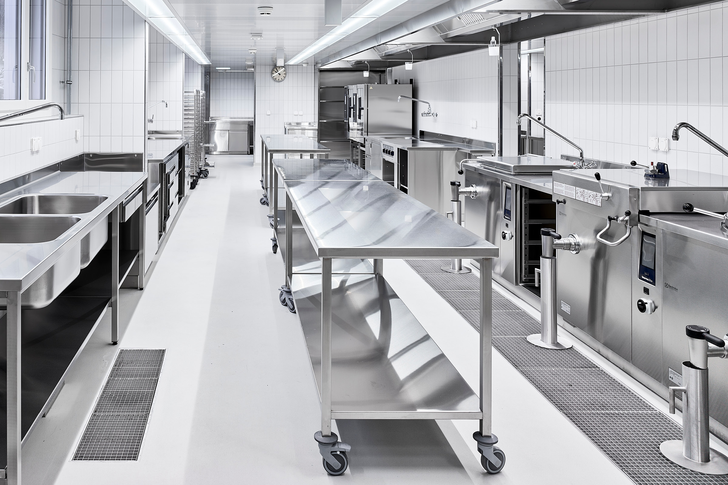 Die Haustechnik im Eingangsgeschoss und die Lüftungsanlagen im Dachgeschoss muss erneuert und angepasst werden. Der Gastronomiebereich im 1. Obergeschoss soll neu strukturiert und dessen Infrastruktur ersetzt werden. Die Trennwände des Schulungsraums bleiben erhalten, sind jedoch um ein Raster angepasst. Auch der wertige Bodenbelag aus Kunststeinplatten bleibt erhalten und ist wo nötig mit neuen, dunkleren Kunststeinplatten ergänzt. Die neue Küche erhält ein zeitgemässes Layout und bietet Platz zur Produktion von bis zu 200 Menüs. Die Verbesserung der Erdbebensicherheit erfordert den Ersatz einer gemauerten Längswand aus Sichtstein, welche die Gastroküche und den Essbereich voneinander trennte, durch eine neue in Längsrichtung wirkende Betonwand. Aus dieser Not machen wir eine Tugend: anstatt die baulich aufwändige Erdbebenwand zu verputzen und zu verstecken, wird diese als Sichtbetonwand bewusst gezeigt und inszeniert. Eine Schalung aus OSB-Platten (Oriented Strand Board, eine Platte aus Abfallholz-Spänen) verleiht ihr eine ungewohnte Struktur und Lebendigkeit, welche mit der Robustheit des Materials kontrastiert.