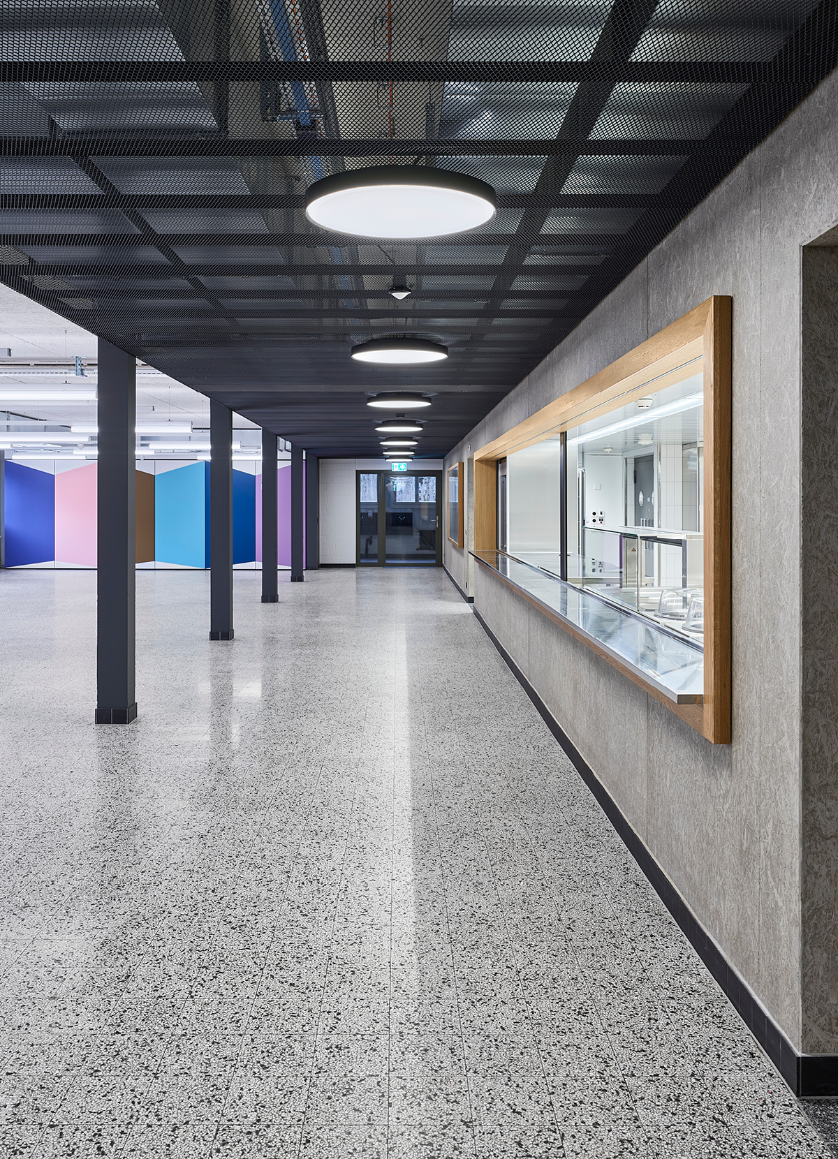 Diese neue Wand bildet das Rückgrat des Gastronomiebereichs und übernimmt die Funktionen Essensausgabe, Geschirrrückgabe und Infoboard. Die hierfür notwendigen Einbauten sind in Eiche oder mit dunkel gestrichenen OSB-Platten erstellt. Die Lüftungsleitungen an der Decke sind entlang der Betonwand mit einem dunklen Streckmetall verkleidet, was zusammen mit der dunkel gestrichenen Stützenreihe den Raum zoniert.